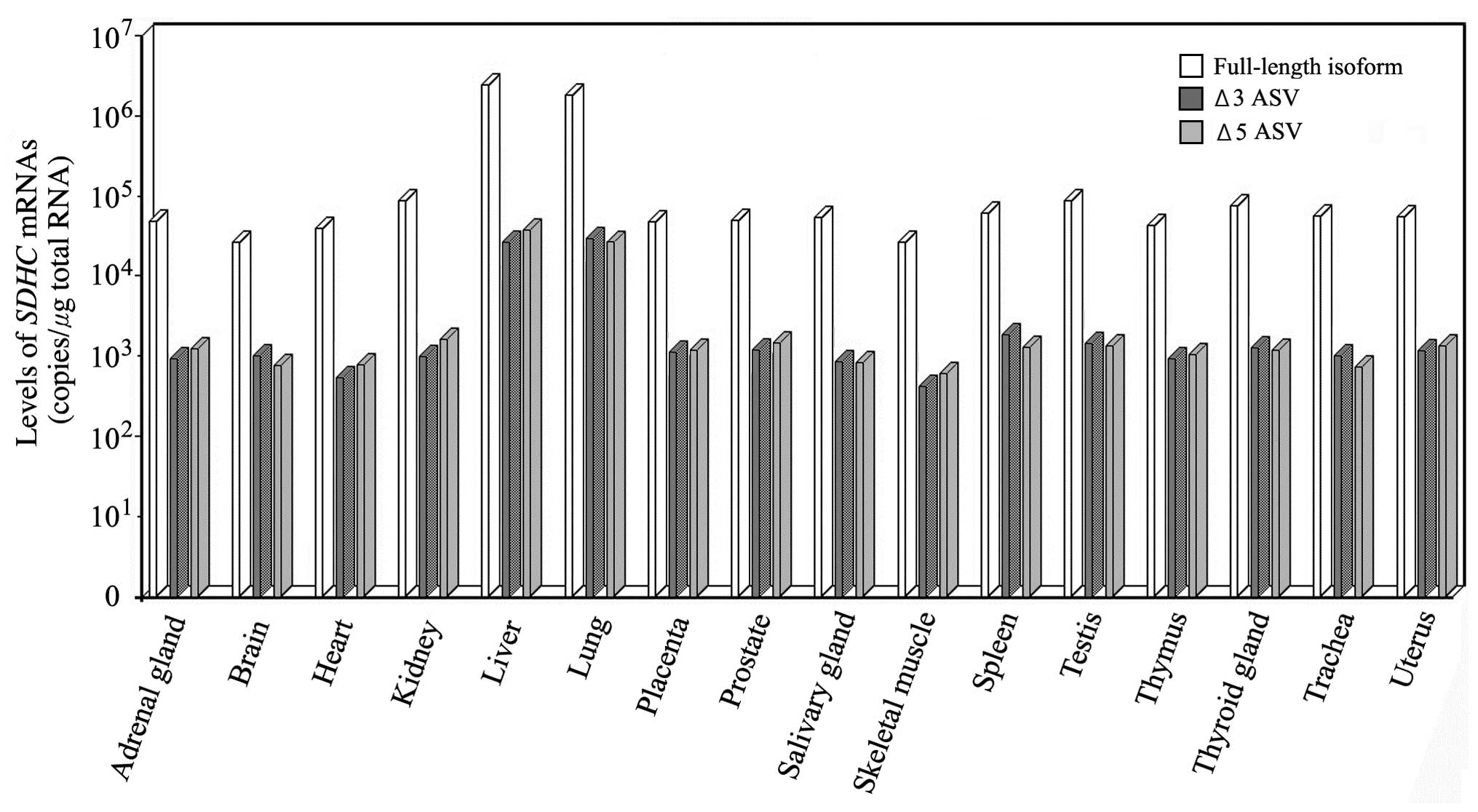 Using RT-PCR with the primer sets for exons 1 and 6 of human SDHC mRNA, amplification products of three sizes were obtained; specifically, a major amplification product of 566 bp, and minor products of 464 and 402 bp (Fig. 1). To determine isoform expression in vivo, real-time RT-PCR was used to examine normal cells derived from 16 tissues, which included the adrenal gland, brain, heart, kidney, liver, lung, placenta, prostate, salivary gland, skeletal muscle, spleen, testis, thymus, thyroid gland, trachea and uterus. Full-length SDHC mRNA was expressed in every tissue examined. Δ3 and 5 ASV mRNAs were also ubiquitously expressed, but by two orders of magnitude lower than that of the full-length mRNA (Fig. 2).