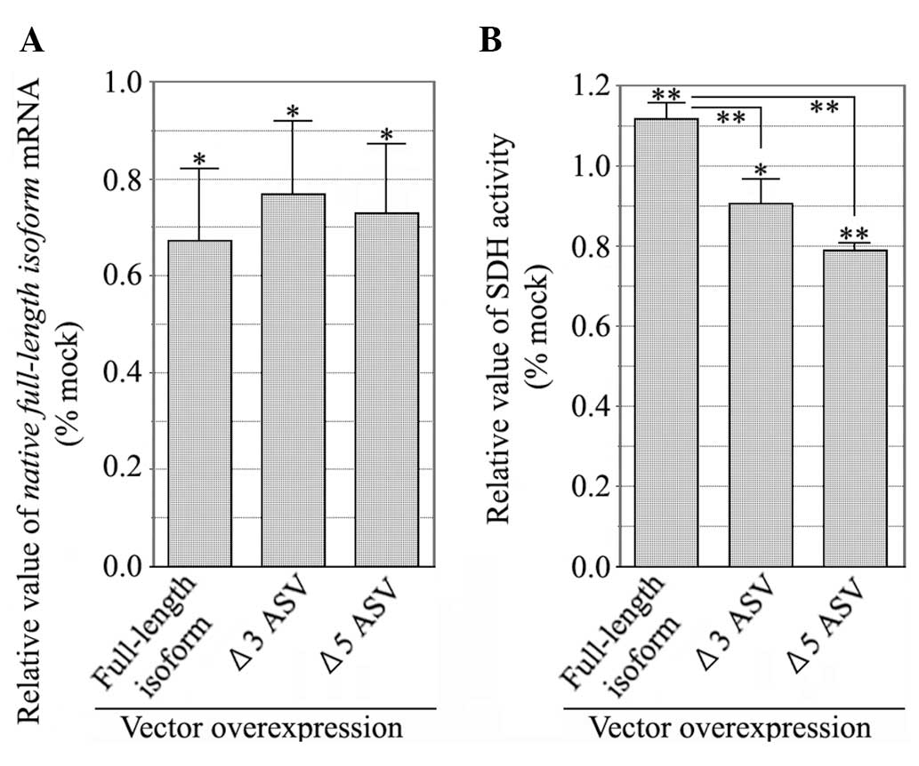 The expression levels of endogenous SDHC mRNA in SDHC ASV overexpressing cells were measured by real-time RT-PCR. Compared with the mock-transfected cells (transfected using empty pTriEX-3 neo vector), the endogenous SDHC mRNA levels in cells transfected with SDHC ASV overexpression vectors, were significantly decreased to ~30%. These results suggested that SDHC ASVs act as potent dominant-negative inhibitors of the full-length isoform (Fig. 4A).
