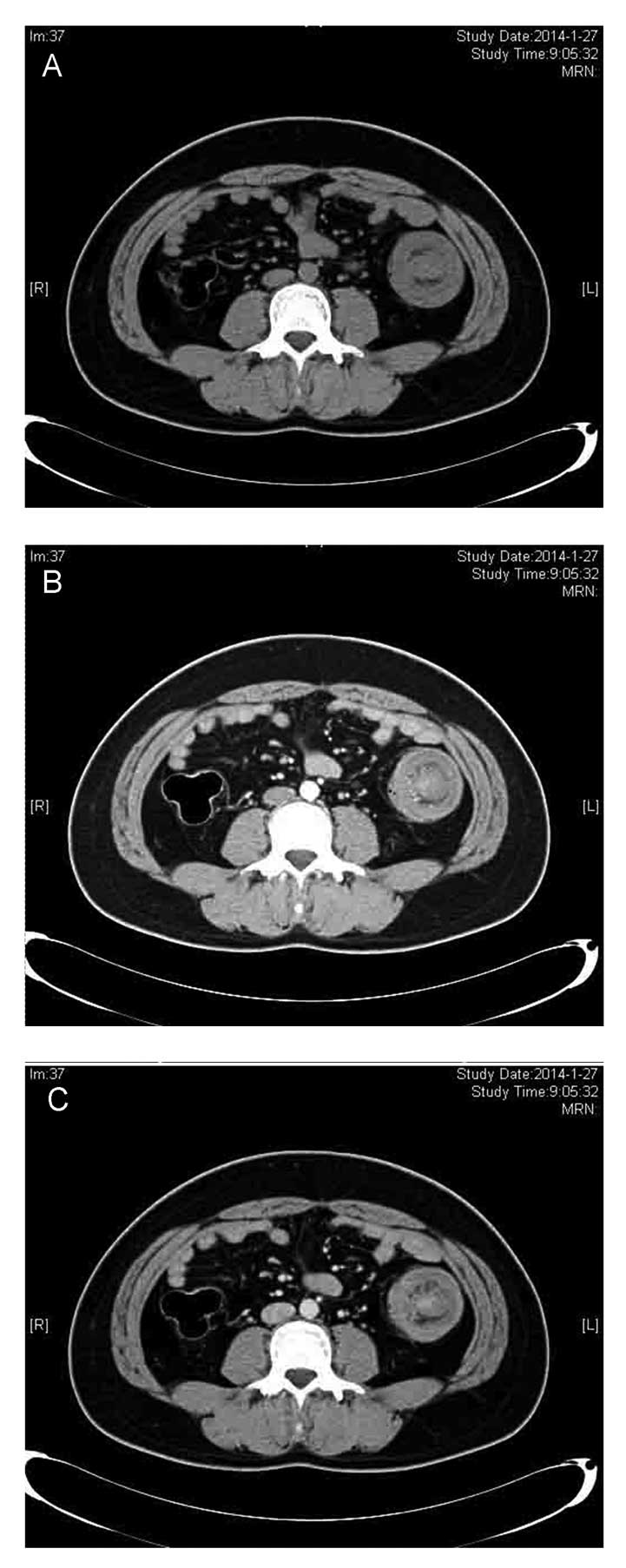 Xu XQ, Hong T, Liu W, et al: A long adult intussusception secondary to transverse colon cancer. World J Gastroenterol. 19:3517–3519. 2013. View Article : Google Scholar : PubMed/NCBI