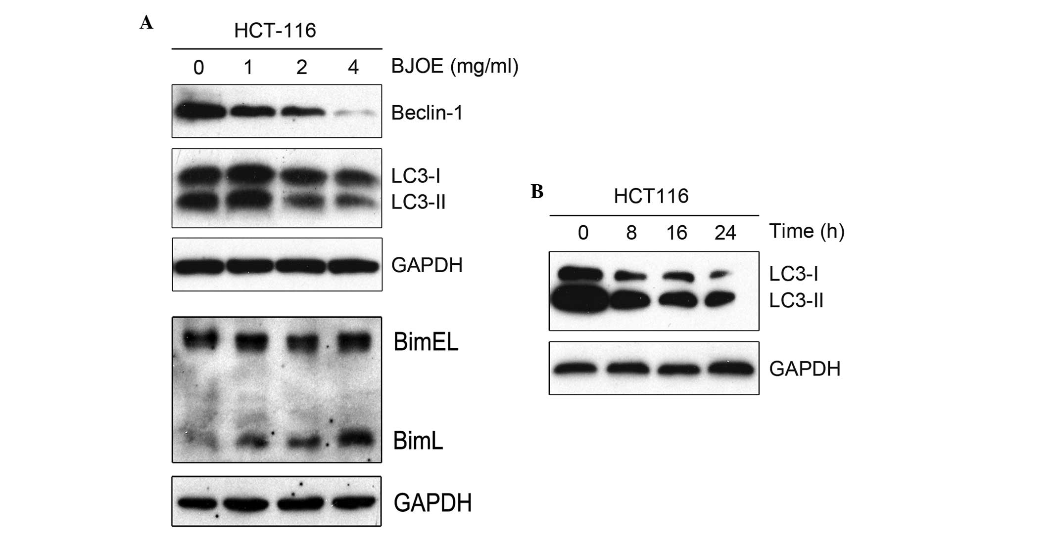 The present study indicated that the apoptosis induced by BJOE may be partially attributed to autophagy inhibition in the present study, however, the key factor for their interaction is unknown. The association between autophagy and apoptosis is complex, with the two processes appearing to antagonize each other; autophagy targets caspases for degradation, while caspases cleave autophagy-related proteins (32). Bim, the first Bcl-2 family member identified to possess anti-autophagy and pro-apoptosis functions, was investigated in the present study. BimEL and BimL appear to inhibit autophagy by sequestering Beclin-1 (33); in the present study, a simultaneous, dose-dependent increase in BimL and decrease in Beclin-1 was observed in the BJOE-treated HCT116 cancer cells, indicating that BimL may be important in the association between BJOE-mediated apoptosis induction and autophagy inhibition. The complex signaling network between apoptosis and autophagy has yet to be fully elucidated, for example, it is not known which targets in the signaling network are modulated by BJOE, or whether specific compounds in BJOE inhibit autophagy while others promote apoptosis to establish BJOE as a ‘double killer’.