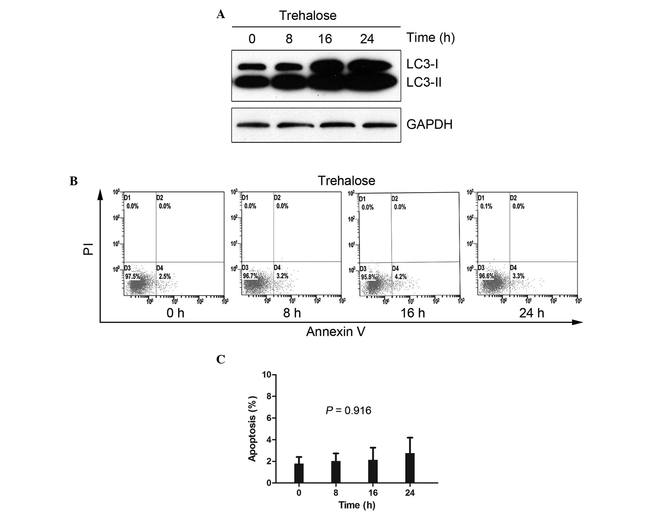 Rapamycin is a classical autophagy inducer that blocks mammalian target of rapamycin (mTOR), a critical signaling pathway for cell survival and proliferation. The simultaneous used of rapamycin and other agents results in unclear data, therefore, the present study used trehalose, an mTOR-independent autophagy inducer with little cell toxicity (18). In the current study, a time-dependent increase in LC3-II was consistently observed in the 50 mM trehalose-treated HCT116 cells, indicating that trehalose is an effective inducer of autophagy (Fig. 2A). To clarify whether trehalose induces apoptosis at a concentration of 50 mM, an apoptosis detection assay was performed on the trehalose-treated HCT116 cells for 8, 16 and 24 h using Annexin V-FITC/PI staining (Fig. 2B). No significant changes were noted following 24 h of exposure, with apoptosis rates of 1.8±1.0, 2.0±1.2, 2.1±2.0 and 2.8±2.4% identified at 0, 8, 16 and 24 h, respectively (P=0.916; Fig. 2C).