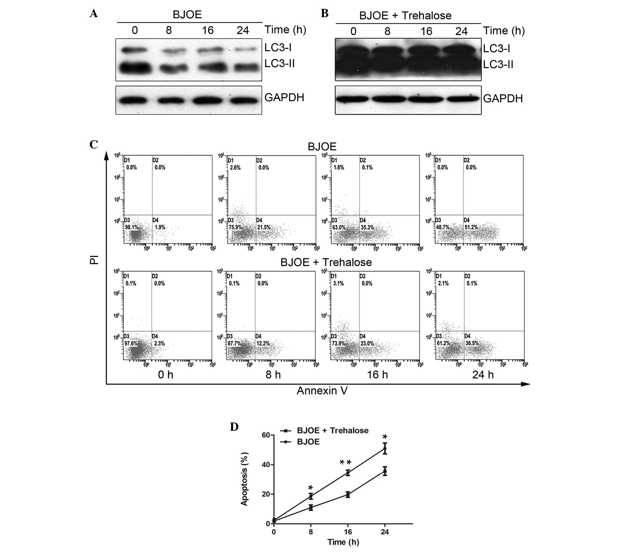 To determine whether autophagy inhibition was an antitumor mechanism, an apoptosis detection assay using Annexin V-FITC/PI staining was performed on the HCT116 cells following exposure to BJOE with or without trehalose. As indicated in Fig. 3C, 2 mg/ml BJOE alone resulted in time-dependent apoptosis in the HCT116 cells. Following a 24-h treatment with BJOE, ~50% apoptotic cells were observed, indicating that BJOE is a strong inducer of apoptosis. However, the apoptotic cell rates induced by BJOE and trehalose were significantly reduced at 8h (18.6±3.2 vs. 11.0±3.0%; P=0.041), 16h (34.5±3.3 vs. 19.7±3.0%; P=0.005) and 24 h (51.0±6.3 vs. 35.6±5.1%; P=0.031) compared with BJOE treatment alone (Fig. 3D).