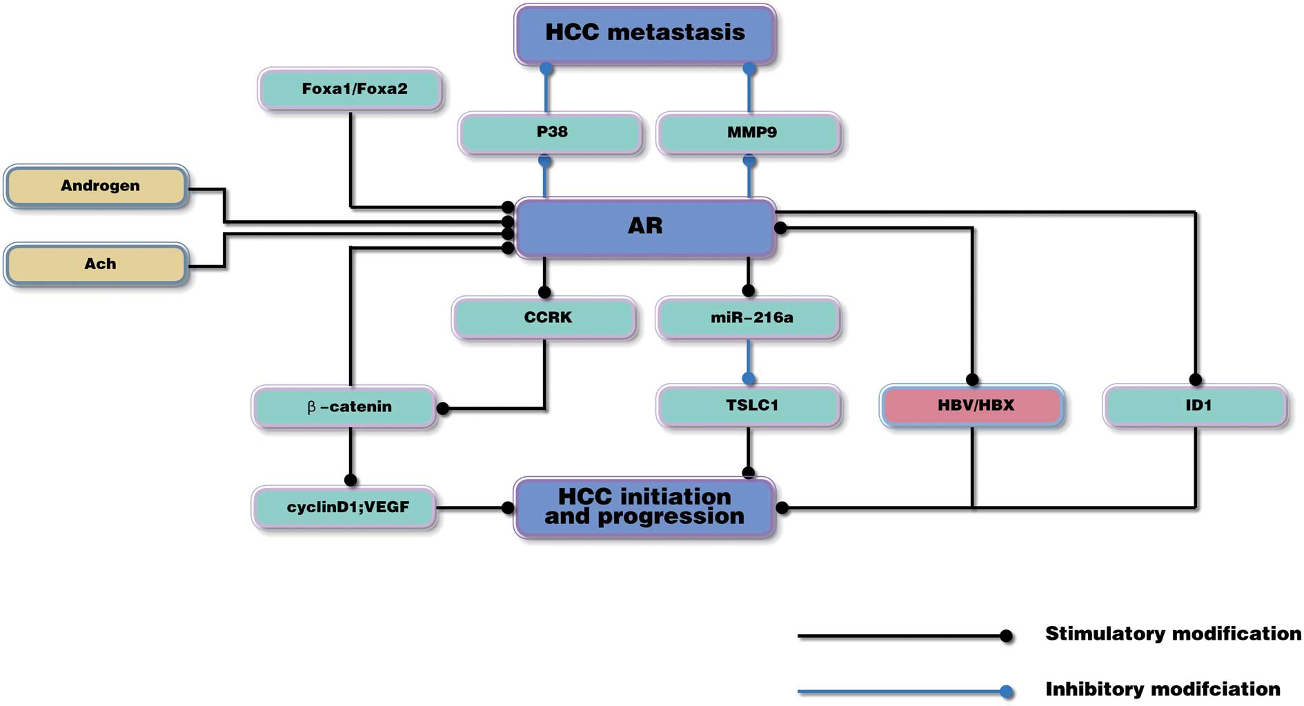 Increasing evidence suggests that HBx is able to enhance AR activity and increase AR-mediated cell transformation in the presence and absence of DHT (39,46), which may explain the higher incidence of male HBV-associated HCC (38). Nie et al (14) revealed that ACh promotes the migration and invasion of HCC cells by activating the AR transcriptional activity and upregulating AR expression. Previous studies have demonstrated that the ACh degradation enzyme, acetylcholinesterase, is downregulated in HCC. This can lead to an increase in the level of ACh, which subsequently activates the ACh receptor (AChR) and promotes the proliferation of HCC cells (56). In addition, Nie et al (14) demonstrated that the expression of AR was upregulated by ACh in a dose-dependent manner in HCC cells, and that the upregulated expression of AR was inhibited by the AChR antagonist, mecamylamine. Furthermore, downregulation of AR was identified to significantly reverse the ACh-induced migration and invasion of HCC cells, which indicates that AR is a major mediator of ACh-induced tumorigenicity. Considering the role of non-androgen-mediated AR signals in hepatocarcinogenesis and the observation that androgen ablation therapy in treating HCC provided inconsistent results (57,58), it may be hypothesized that the AR, rather than androgens, represent an improved therapeutic approach to target HCC.