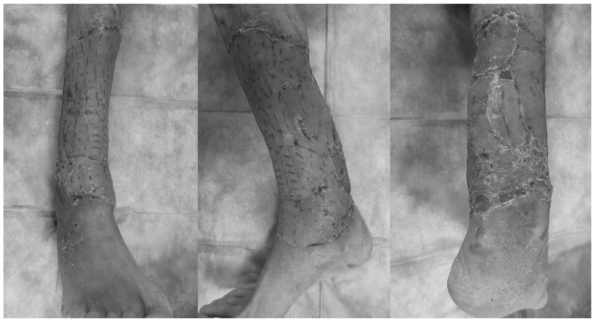 Squamous cell carcinoma (SCC) of the skin, which develops from the keratinocytes of the epidermis, is the second most common skin malignancy and accounts for 20% of all skin cancers (1). The incidence of SCC continues to increase (2) and represents a major public health concern due to the associated significant health costs and marked disfigurement following surgical excision. Patients with primary SCC have a good prognosis, however, the long-term prognosis is relatively poor for those with metastatic disease, which has a 10-year survival rate of <20% (2). Clinically, the diagnosis of SCC is confirmed by skin biopsy. At present, treatment modalities include radiotherapy, brachytherapy, electrodesiccaation, cryotherapy and photodynamic therapy, however, surgical excision and Mohs micrographic surgery (MMS) are considered the gold standard treatments for high-risk SCC (3). Despite this, due to the high cost and complicated surgical process, at present MMS is not widely used. The omental flap, a classical reconstructive flap widely used for the treatment of ulcers and defects of the breast, may provide a vascularized recipient bed for skin grafts and thus, may adapt well to an ischemic environment, such as the lower limb (4). In this study, the case of a male patient with a large SCC in the lower part of the right leg, who underwent extensive resection with reconstruction using an omental transposition flap, is presented.