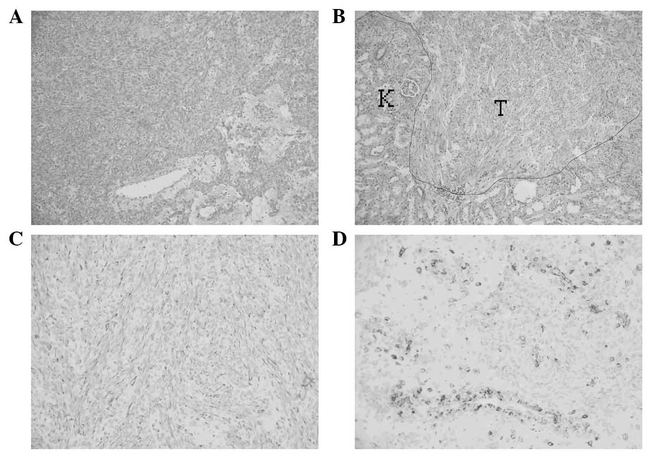 A 51-year-old female was admitted to hospital after experiencing stiffness and discomfort in the upper right abdomen for longer than one month, and subsequently, an opacity in the retroperitoneum was revealed by ultrasonography. The patient's symptoms of stiffness and discomfort were accompanied by a limitation in deep breathing and nighttime dyscoimesis of unknown cause. The stiffness recovered spontaneously after several hours. The patient did not present with any additional symptoms, for example nausea, vomiting, diarrhoea, melena, coughing or expectoration. During laboratory tests, routine urine analysis revealed the following: Erythrocytes, 27.2/µl (normal, 0.0–22.7/µl); urobilinogen, 50 µmol/l (normal, 1.7–30.0 µmol/l) and bacteria, 425.6/µl (normal, 0.0–130.7/µl). Blood routine was normal, while levels of tumor markers, including α-fetoprotein, carcinoembryonic antigen, carbohydrate antigens (19-9, 125 and 15-3) and ferritin, were also normal. Whole abdomen enhanced computed tomography (CT) identified a massive soft-tissue density shadow of 11.1×10.7×20.0 cm to the rear of the right kidney. Multi-nodular and massive low-density shadows were observed in the mass, with striped high-density shadows within the low-density area (Fig. 1A). A plain scan revealed a CT value of 29.2 Hounsfield units (HU) in the solid section, while an enhanced scan demonstrated an unevenly enhanced solid section with a CT value of 44.6 HU at arterial phase and 77.1 HU at venous phase (Fig. 1B and C). The cystic section of the tumor was not enhanced. The tumor was enclosed and fed with an artery branching from the abdominal aorta and was clearly demarcated; however, the tumor borderline with the right kidney was unclear, and the right adrenal gland and kidney were displaced forward (Fig. 1D). The patient was preoperatively diagnosed as most likely having a retroperitoneal stromal tumor. Following complete preoperative preparation, the patient received resection of the retroperitoneal tumor and the involved right kidney. The findings observed during the surgery were as follows: A large mass (12×20 cm) occupied the right side of the retroperitoneum with a clear margin and capsule. The upper pole of the tumor reached the diaphragmatic dome and was partially connected with the liver and the diaphragm muscle, while the lower pole remained dissociated, and its interior margin abutted the right kidney, which was also found to be partially involved during the separation. Pathological examination with hematoxylin and eosin staining revealed that the tumor cells were fusiform and arranged in bundles and microcapsules (Fig. 2A). The uniformly-sized cells occasionally demonstrated mitotic figures, and the focus invaded the kidney (Fig. 2B), but not the adrenal gland. Immunohistochemical (IHC) staining results were: Pan-cytokeratin(–), Melan-A(–), HMB-45(+), smooth muscle actin (SMA)(+), Desmin(+), CD34(–), P53(+) and Ki-67(+, 2%) (Fig. 2C and D). The final diagnosis was retroperitoneal PEComa involving the kidney. The patient recovered well following surgery, without further treatment. No recurrence was identified during the follow up at 7 months post surgery.