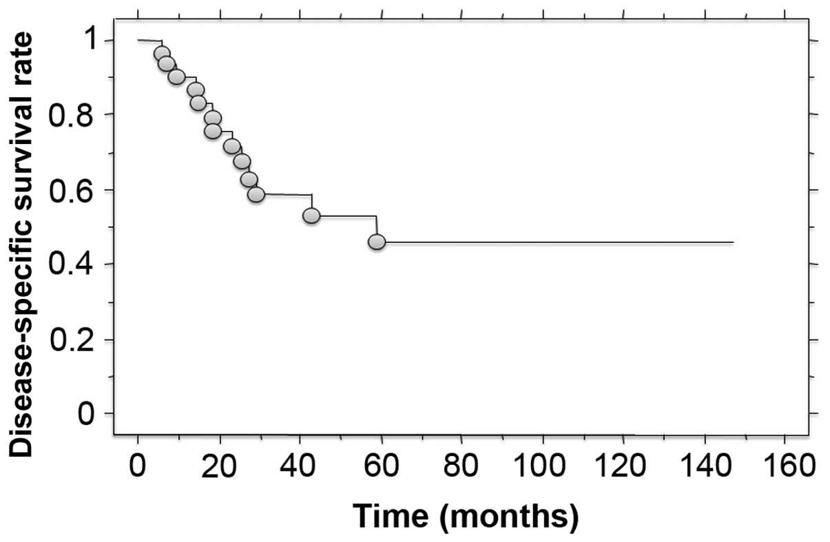 Of the 30 patients included in the present study, 12 were alive and disease-free in March 2014 (last review), while 3 patients were alive with disease. However, 13 patients succumbed to the disease and 2 due to other causes; the average survival time after the treatment in these 13 patients was 22.8 months (range, 6–59 months) The disease-specific survival was 58.5% at 3 years and 46.1% at 5 years after treatment (Fig. 1). Local recurrence was detected in 13 patients, and distant metastasis was identified in 17 patients as the first relapse. The 3- and 5-year event-free survival rates were 24.4 and 16.3%, respectively (Fig. 2). Of the 28 patients treated with limb salvage surgery, 3 patients eventually underwent amputation due to local recurrence. The log-rank test revealed no statistically significant association between disease-specific or event-free survival, and the following factors: patient age and gender, tumor histological grade and administration of adjuvant therapy.