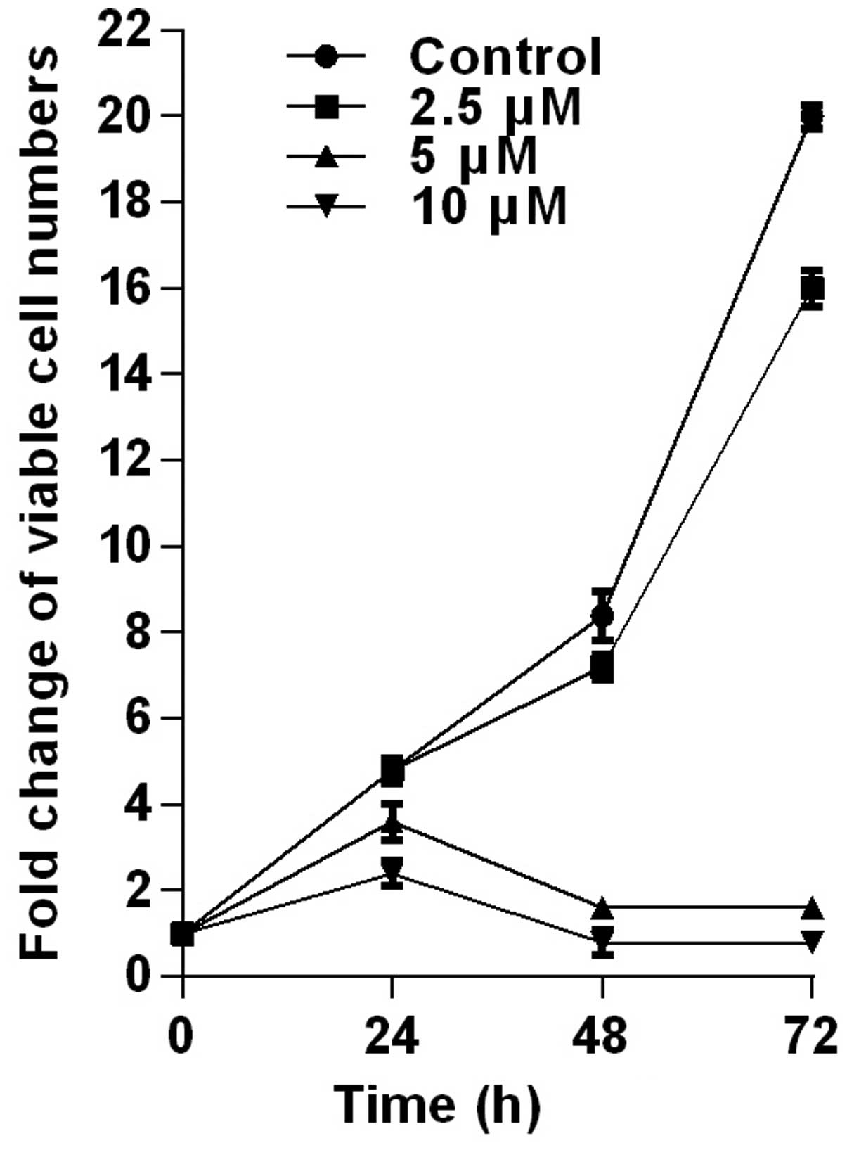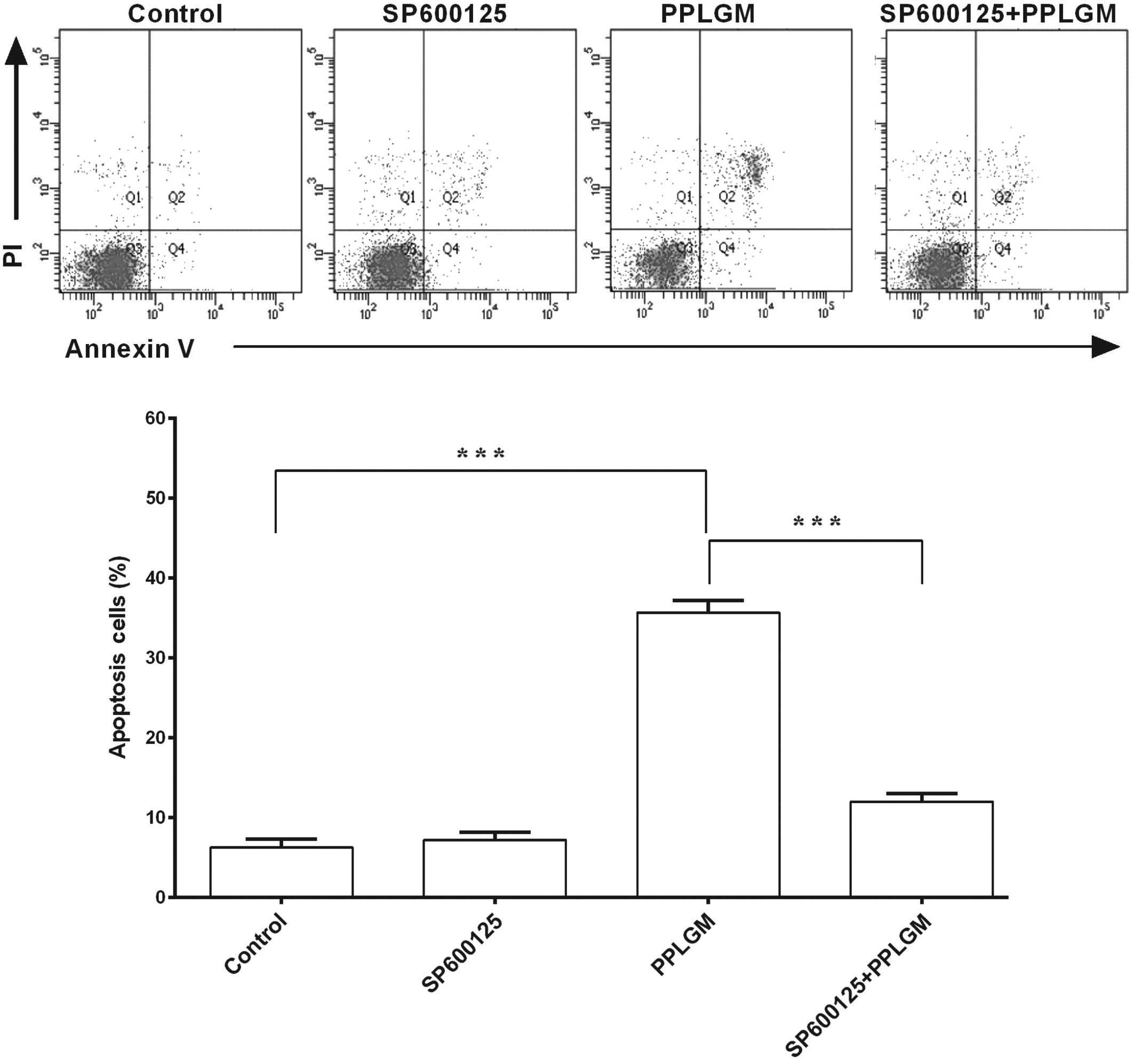 In summary, the present results suggested that in the HCT116 cells, PPLGM reduced cell viability and triggered cell apoptosis through the JNK signal pathway in a concentration- and time-dependent manner. A clear understanding of the molecular mechanisms of PPLGM-mediated cell apoptosis may shed light on the further clinical development of PPLGM for chemotherapy.