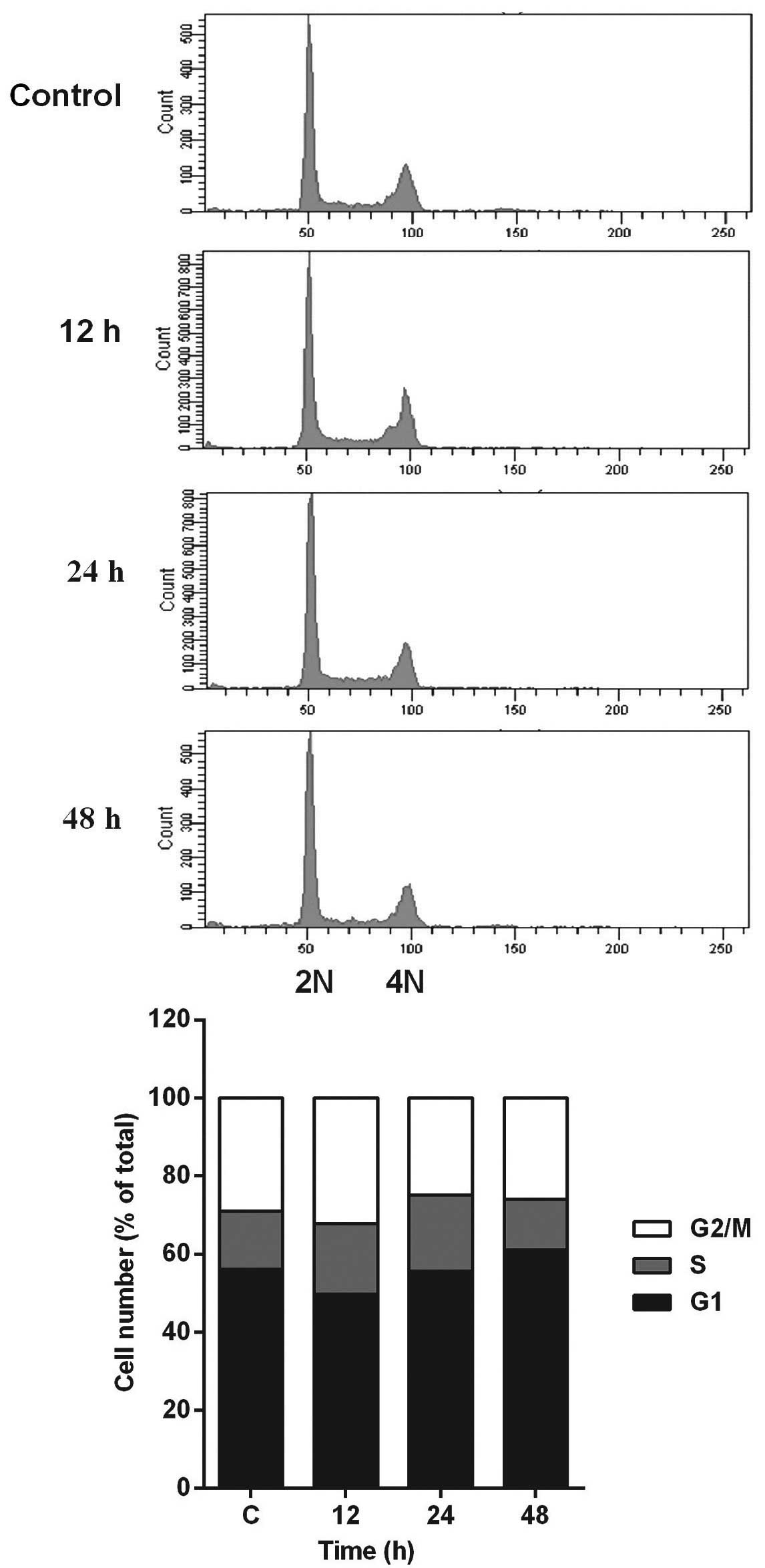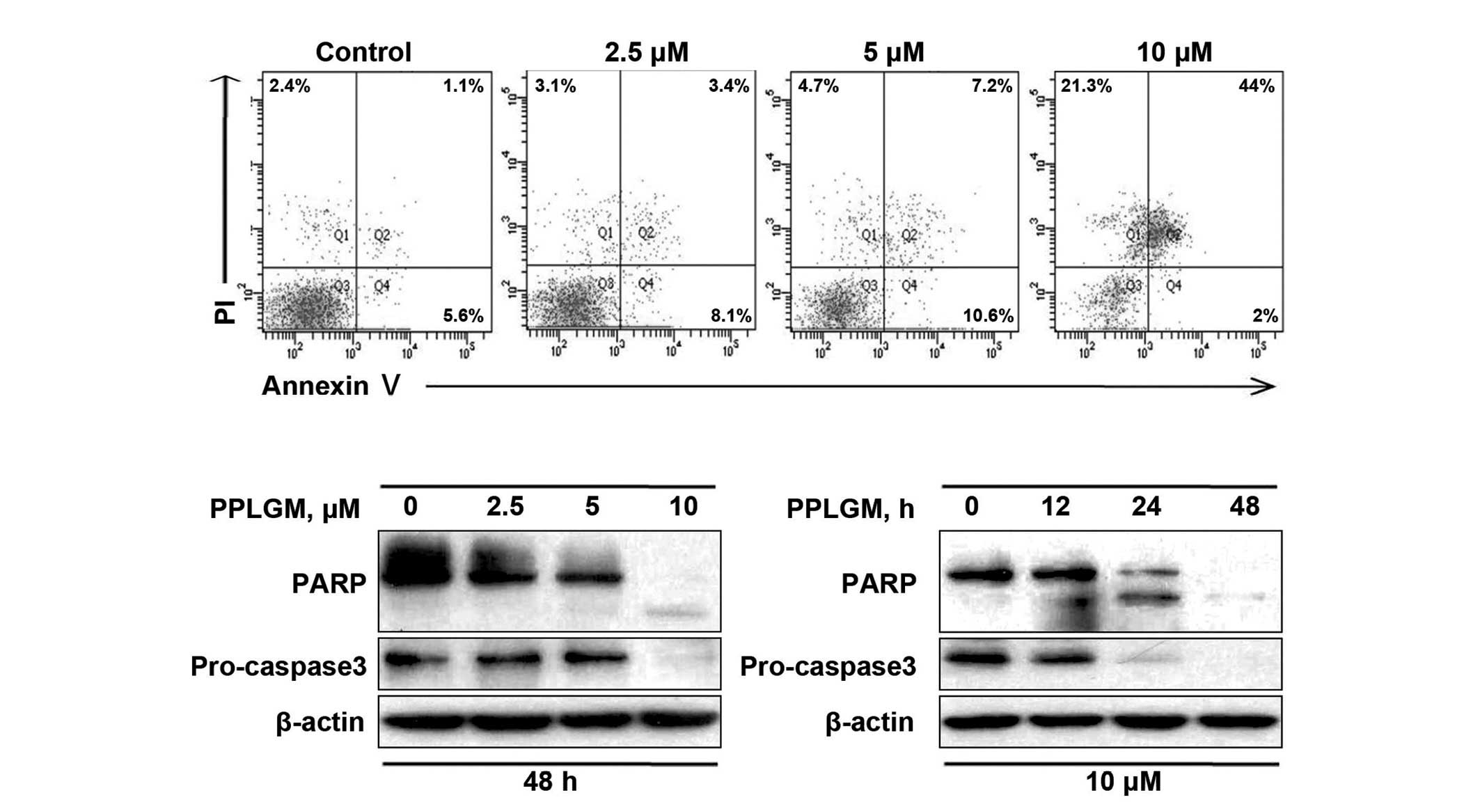 Accumulated data have shown that PPLGM induces cell death through different pathways in multiple types of cancer cells (7–12). Previous studies have demonstrated that caspase-3-mediated PARP cleavage and cell cycle arrest at the G2/M phase are involved in PPLGM-induced cell apoptosis in human prostate cancer PC-3 cells (11). In the present study, HCT116 cells treated with PPLGM demonstrated likewise up-regulation of PARP/procaspase-3 cleavage (Fig. 4B), but not cell cycle arrest (Fig. 3); this discrepancy in the effect of PPLGM on cell cycle distribution may be a result of the different responses to PPLGM in different cell lines.