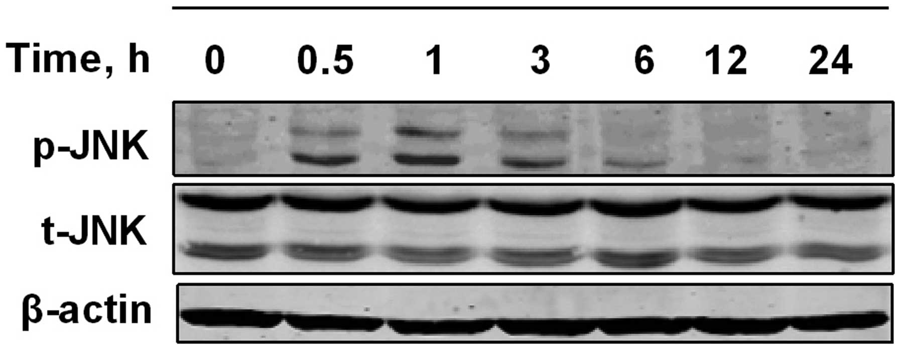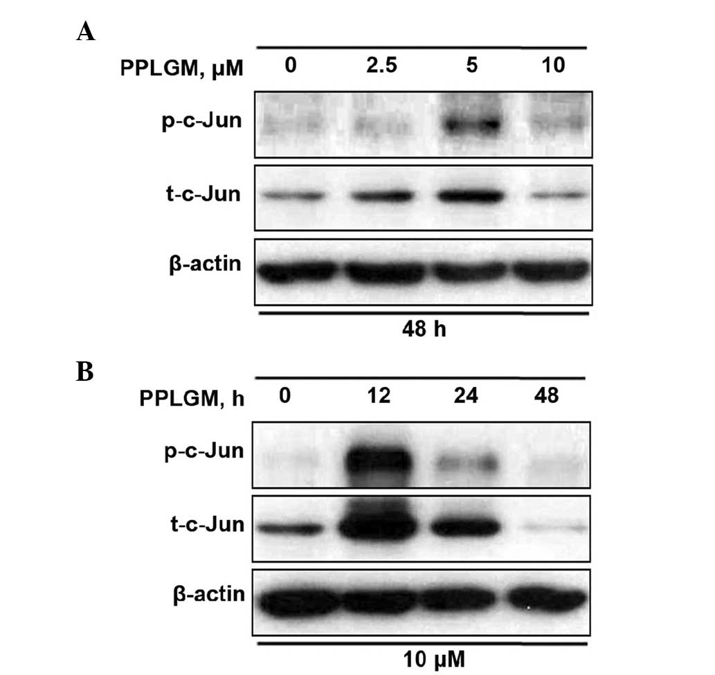 c-Jun, a cognate substrate for JNK, is a labile protein that is degraded by JNK under non-stressed conditions (24). However, a variety of cellular stresses, such as oxidative stress, can strongly activate the JNKs, which inhibit c-Jun ubiquitination and promote c-Jun transcription through c-Jun phosphorylation (24,25). Inhibition of the ubiquitin-proteasome system induced by PPLGM in cancer cells may also reduce the ubiquitin-dependent degradation of c-Jun (26). Collectively, a steady elevation of c-Jun expression is associated with the expression and stabilization of c-Jun. Hence, in the present study, it followed that sustained c-Jun phosphorylation was concomitant with the c-Jun overexpression observed during PPLGM treatment (Fig. 5).