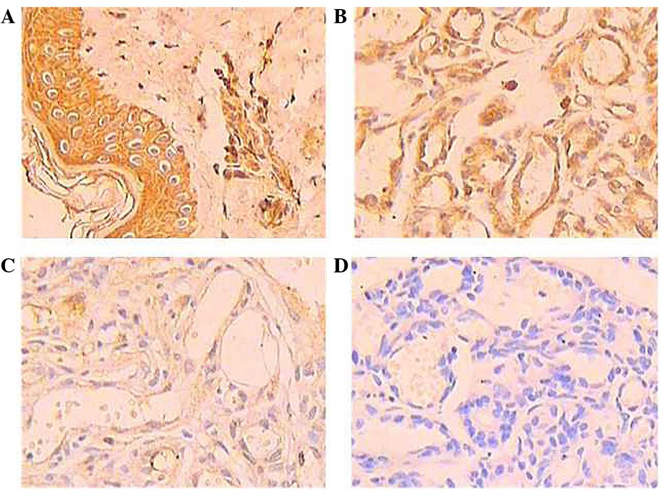 Table I.p16 expression in normal tissue, involuting hemangioma tissue and proliferating hemangioma tissue. |