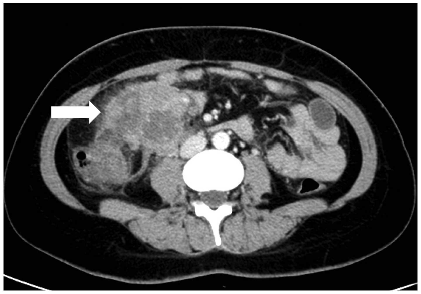 A normal chest X-ray was obtained. An abdominopelvic contrast-enhanced computed tomography (CT) scan (Fig. 1) revealed: i) A bulky soft-tissue dense mass in the middle of the ascending colon and superior to the ileocecum; heterogeneous enhancement following enhanced scan; thickened anterior of the renal fascia of the right kidney and local parietal peritoneum. ii) Multiple renal cysts in both kidneys. The CT scan did not indicate any bowel involvement, distant metastasis or abdominal lymph node enlargement. The abdominal ultrasound did not reveal any coexisting lesion in the hepato-pancreato-biliary system. Single-photon emission computed tomography (SPECT) renal imaging (99mTc-DTPA) revealed that the glomerular filtration rate was slightly decreased and the upper urinary tract had unobstructed drainage in the two kidneys.
