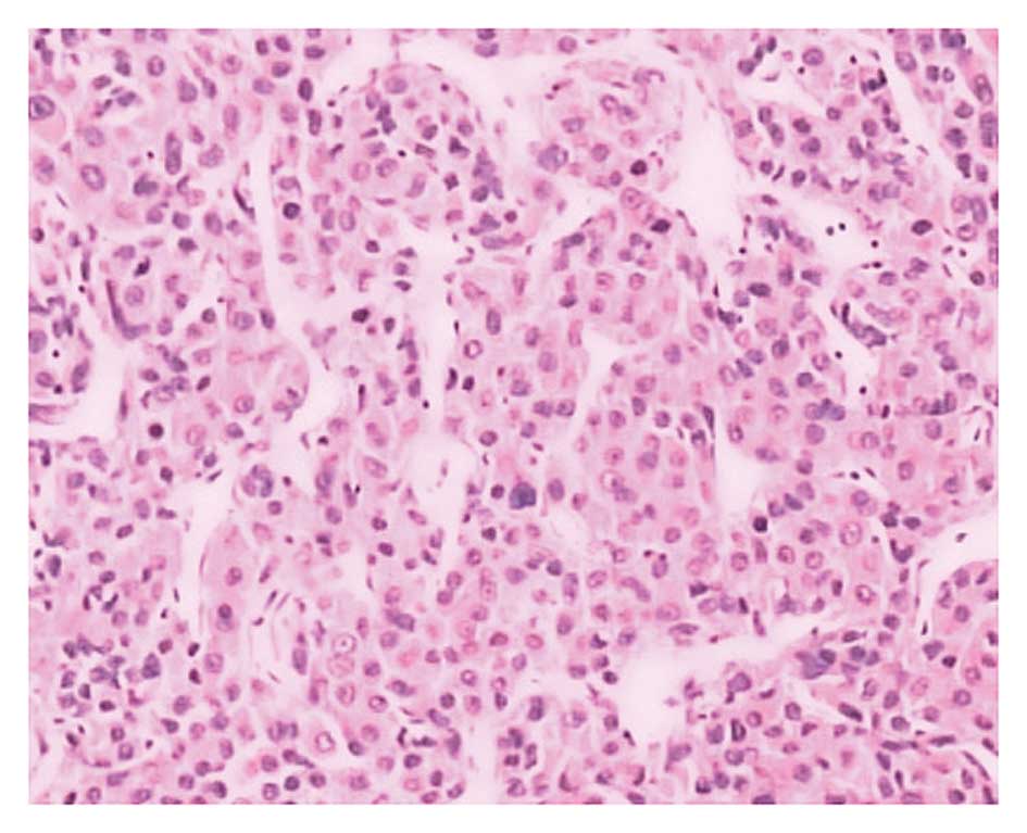 The patient received posterior surgery via a intramedullary tumor resection at the T3 vertebra, internal fixation of screws at the T2-4 pedicle, bone graft fusion between the transverse processes and intradural exploration. The spinal cord was expanded and during the exploration, a yellowish soft mass was found in the T3 spinal canal. The mass was ~4×4×20 mm and was well defined. The mass was isolated from the spine gradually until no tissue residue remained and no clear hemorrhage from the wound surface was left. Unexpectedly, the post-operative histopathological examination revealed a moderately-differentiated HCC (Fig. 2). Immunohistological examination results were as follows: Cytokeratin (CK)19(−), Hep1(+), glypican-3(+), cluster of differentiation (CD)10(+), CK7(−), synaptophysin(−), chromogranin A(−), IMP-3(−) and CD56(−), with a Ki-67 of ~6%, which was in accordance with the diagnosis of HCC. As the pathological diagnosis was not in agreement with the imaging diagnosis and intraoperative exploration, the pathologist suggested further examinations of the liver.