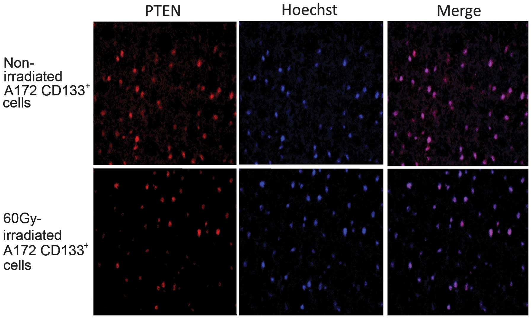 Immunostaining for PTEN was positive in the non-irradiated A172 CD133+ cells (positive rate, 80%; score, 3). The expression of PTEN was markedly decreased in the A172 CD133+ cells following irradiation with 60 Gy (positive rate, 10%; score, 1) (Fig. 2).