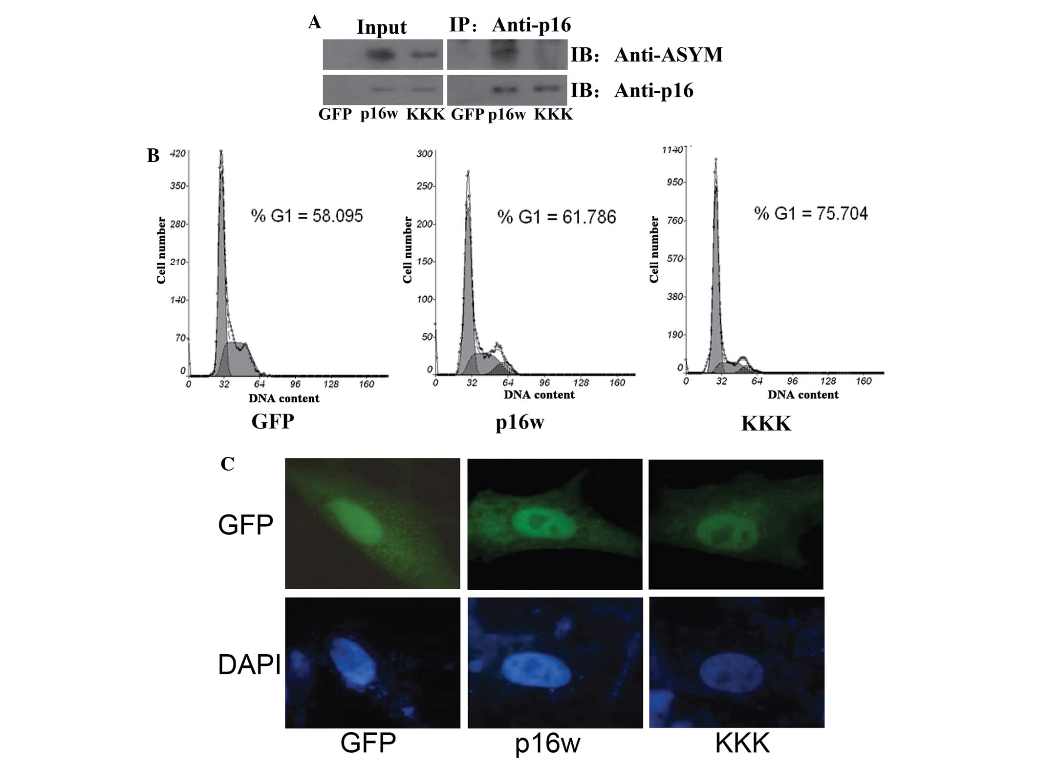 The EGFP-p16 expression plasmids carrying three arginine-lysine point mutations, consisting of R22/131/138K (p16KKK), were generated. Firstly, the wild-type p16 and p16KKK vectors were transfected into A549 cells, then analyzed using CoIP assays performed using the cell extracts. The extracts from the A549 cells were immunoprecipitated using antibodies against p16, and detected in immunoblotting with antibodies against p16 and asymmetric dimethylarginine (Fig. 1A). The findings of CoIP revealed that the wild-type p16 protein was methylated, while the methylation of p16KKK was prominently reduced. Next, the cell cycle distribution was detected using flow cytometric analysis (FACS). The results revealed that overexpression of the wild-type p16 protein caused an accumulation of cells in the G1 phase. However, cells overexpressing the p16KKK protein exhibited an increased accumulation of cells in the G1 phase (Fig. 1B). Finally, the A549 cells were transfected with the wild-type p16 and p16KKK vectors, and the expression was detected using a confocal laser scanning microscope. The results revealed that the wild-type p16 and p16KKK proteins were located in the nucleus (Fig. 1C). These data indicate that the arginine point mutations in the p16KKK protein led to hypomethylation of the p16 protein and reinforced the increased the ability to prevent cell proliferation.