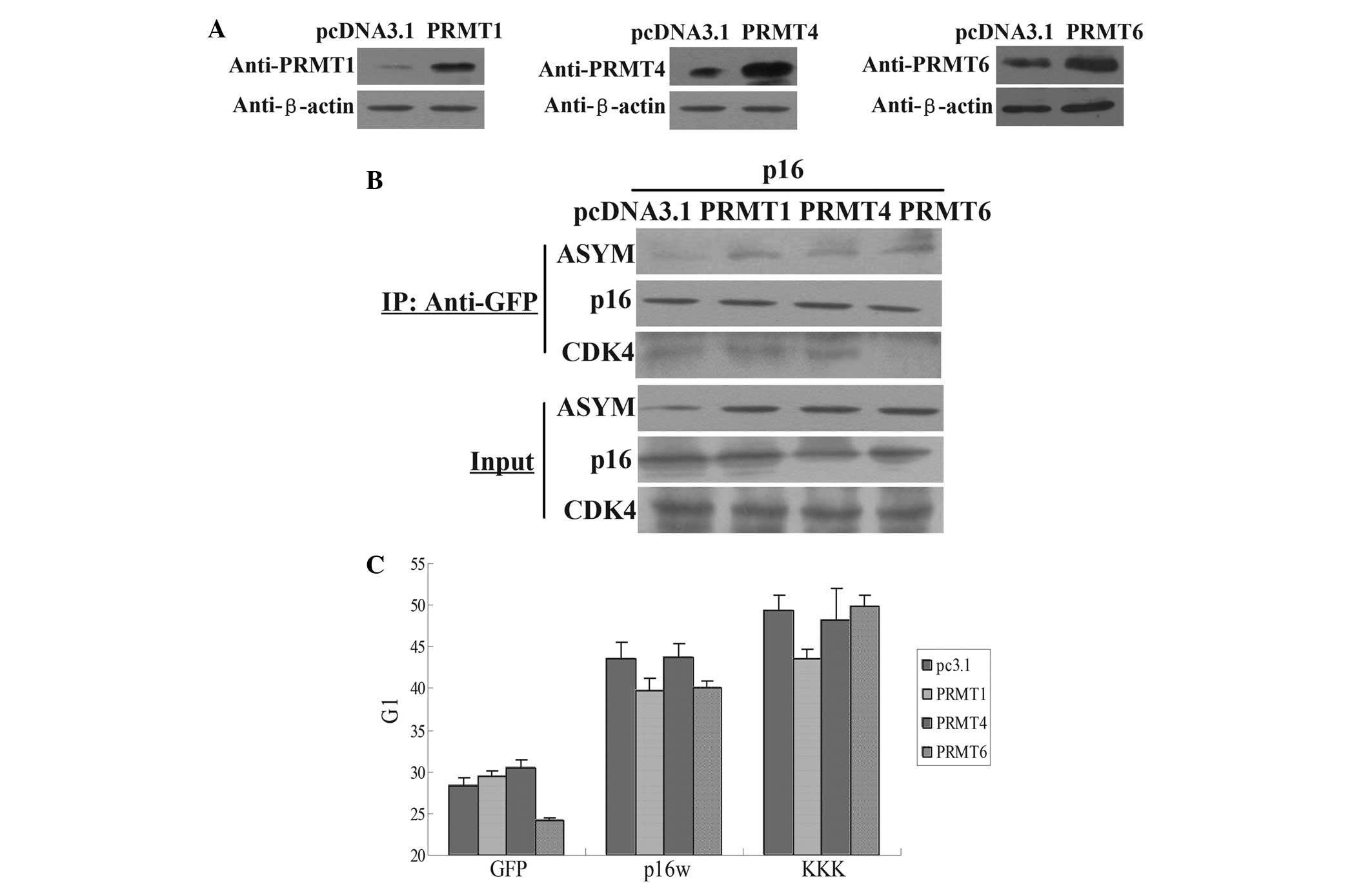 Identification of the protein that PRMT involves in the methylation of the arginine residues of p16 was then attempted. The present results revealed that p16 was modified with asymmetric dimethylarginine (Fig. 1A), suggesting that the type I enzymes are likely to play a role in p16 methylation. Firstly, the exogenous expression of PRMT1, PRMT4 and PRMT6 was measured by western blotting (Fig. 2A). Next, CoIP assay results revealed that the exogenous expression of PRMT1, PRMT4 and PRMT6 increased the methylation level of p16, but only PRMT6 overexpression inhibited the association of p16 and CDK4 (Fig. 2B). In addition, the results of the FACS analysis revealed that transfection with PRMT6 counteracted the arrest of A549 cells in the G1 phase induced by wild-type p16, while PRMT6 overexpression did not affect the arrest of cell cycle induced by p16KKK (Fig. 2C). However, PRMT1 and PRMT4 demonstrated no such effect. Therefore, these data revealed that PRMT6 inhibited the function of p16 through the methylation of arginine residues.