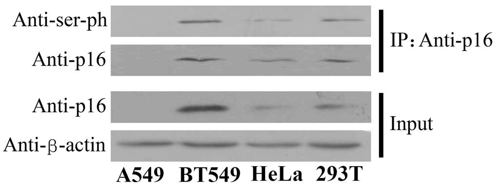 The present study also investigated the effect of other post-translational modifications on the function of the p16 protein. Therefore, the status of serine phosphorylation was examined in four human cell lines derived from various cell types. CoIP assays were performed using the antibody against p16 and the protein expression was detected using the antibody against serine phosphorylation. The findings revealed that the p16 protein was phosphorylated in the human breast cancer BT549, cervical epithelioid carcinoma HeLa and embryo kidney 293T cell lines (Fig. 3). These data indicate that the serine residues of p16 are universally phosphorylated in various cell lineages.