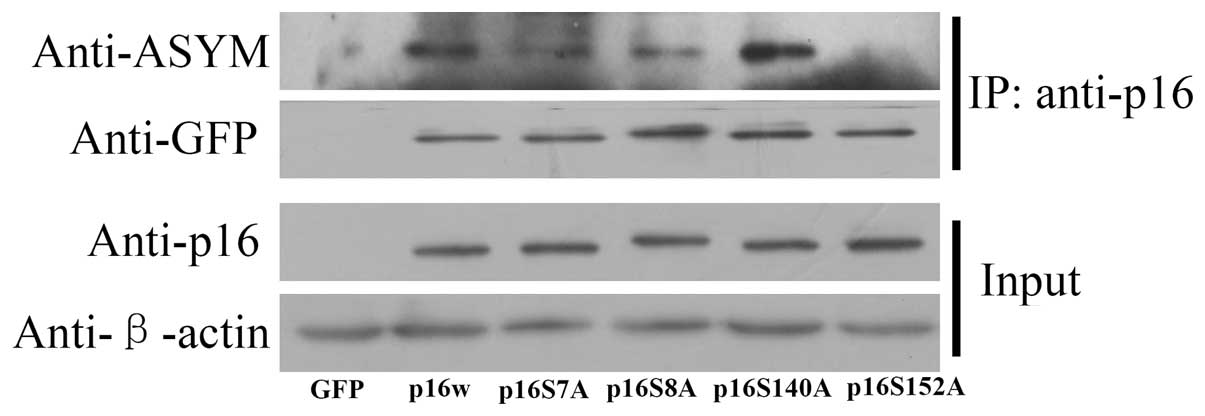 In addition, it has been reported that phosphorylation of p16 protein at Ser152 promotes the association between p16 and CDK4, while phosphorylation at Ser8 abolished the CDK4-inhibitory activity of p16 (7). A previous study identified that hypomethylation of p16 protein exhibited a potentiated function in preventing cell proliferation (8). These results indicated that the post-translational modification of p16 plays an important role in the regulation of the function of p16.