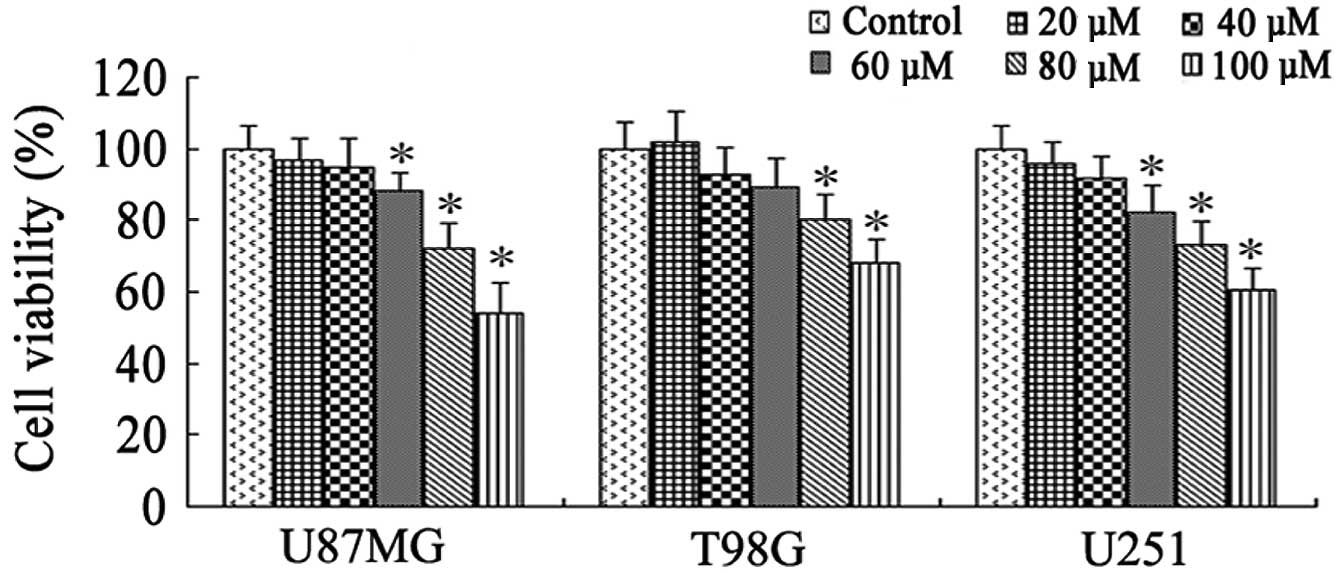 The cytotoxicity of resveratrol was measured using an MTT assay (Sigma-Aldrich). U87MG, T98G and U251 cells were grown in 96-well plates (Greiner Bio-One GmbH, Frickenhausen, Germany) at a density of 5×104 cells/well and cultured for 24 h. Cells were then treated with resveratrol at various concentrations (20–100 µM). Following incubation for 48 h, 20 µl MTT (5 mg/ml) was added to each well and incubated at 37°C for 4 h. Finally, 150 µl DMSO was added to solubilize the formazan crystals, and the amount of formazan salt was determined by measuring the optical density (OD) at 490 nm using a Bio-Rad 680 microplate reader (Bio-Rad Laboratories, Inc., Hercules, CA, USA). Cell viability was expressed as the percent OD value of each group relative to that of control cells.