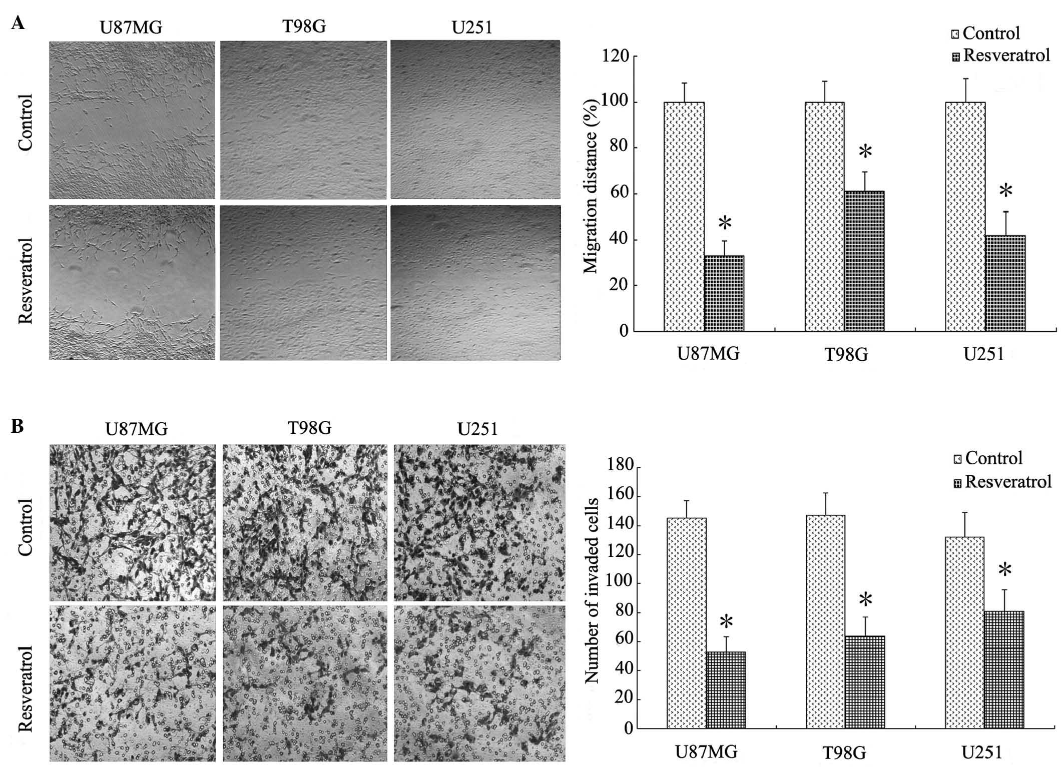 Resveratrol is a natural polyphenol that exists in grapes, berries and peanuts (14). Previous studies reported that resveratrol was able to induce apoptosis and suppress proliferation in various cancer cell types (15,16). In addition, resveratrol has been demonstrated to inhibit cell proliferation and induce apoptosis in glioblastoma cells (17,18). However, the effects of resveratrol on the motility and invasiveness of glioblastoma cells is not well documented. Therefore, the current study aimed to examine the effects of resveratrol on cell migration and invasion in human glioblastoma cells, and to explore the underlying molecular mechanisms.