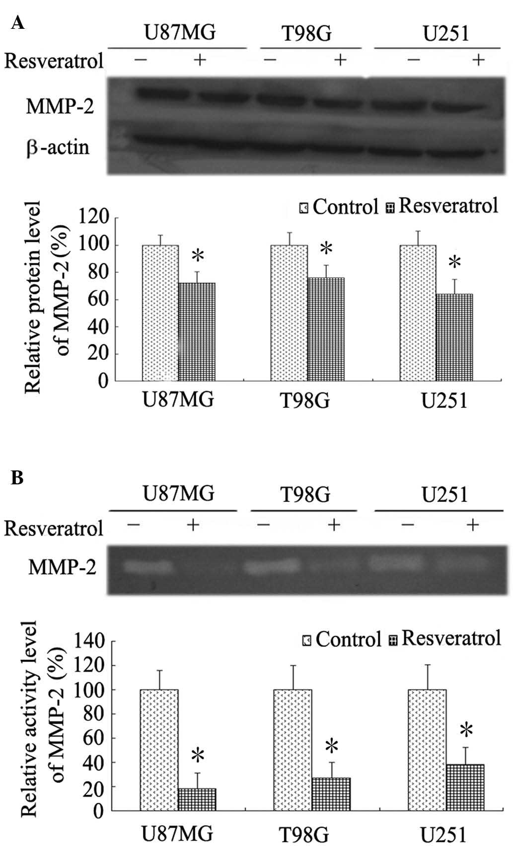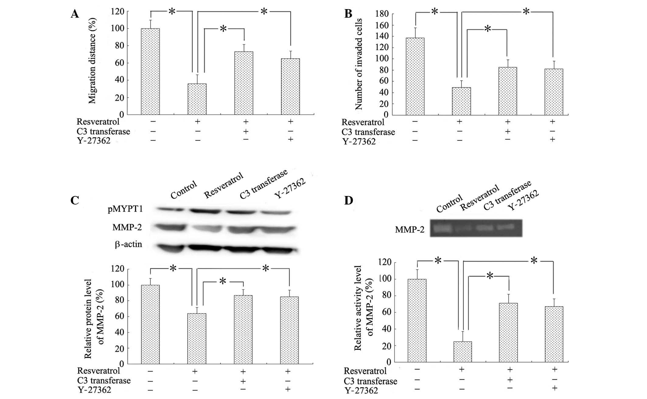 In summary, the present findings indicate that resveratrol may inhibit glioblastoma cell motility and invasiveness via downregulation of MMP-2 and activation of the RhoA/ROCK signaling pathway. These findings highlight resveratrol as a promising therapeutic agent for glioblastoma patients, and form a basis for further investigation of this natural dietary compound.