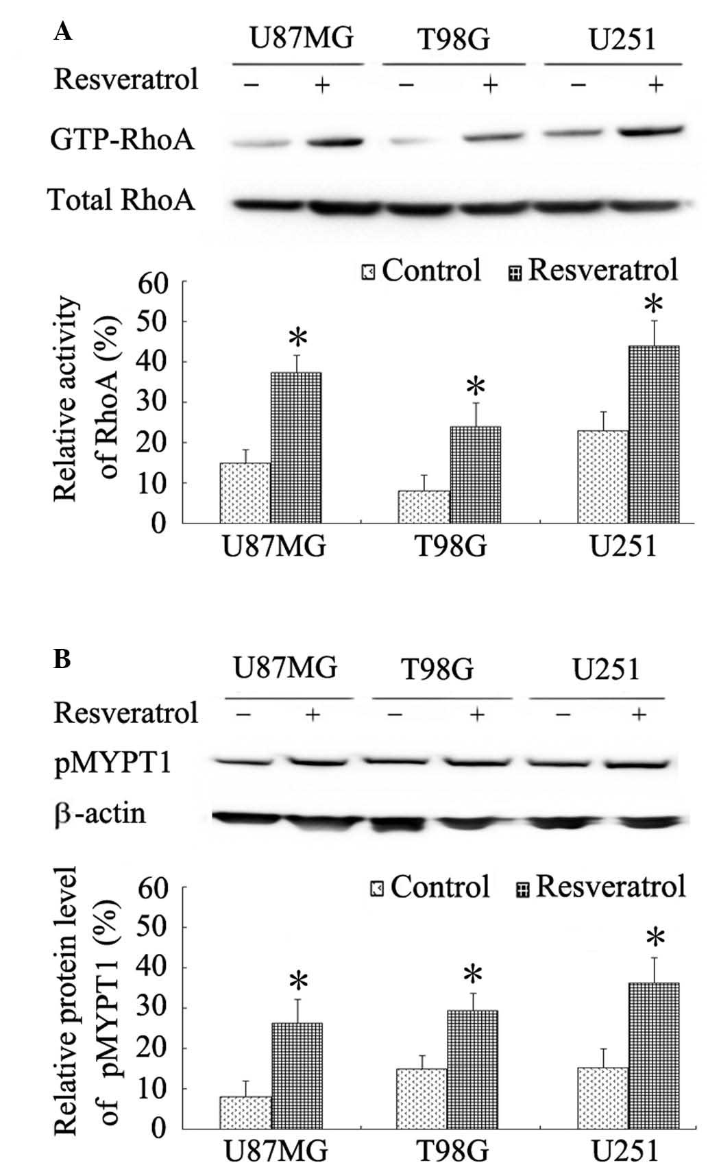 Human glioblastoma U87MG, T98G and U251 cells were obtained from the cell bank of the Fourth Military Medical University (Xi'an, China) and cultured in Dulbecco's modified Eagle's medium (DMEM; Sigma-Aldrich, St. Louis, MO, USA) supplemented with 10% fetal bovine serum (FBS; Shanghai BioSun Sci&Tech Co., Ltd., Shanghai, China) at 37°C in a humidified atmosphere of 5% CO2 and 95% air. Resveratrol (Santa Cruz Biotechnology, Inc., Santa Cruz, CA, USA) was dissolved in dimethyl sulfoxide (DMSO; Thermo Fisher Scientific, Grand Island, NY, USA) to produce a 100 mM stock solution, which was stored at −20°C. Prior to the experiments, fresh DMEM was used to dissolve resveratrol stock solution to working concentrations. C3 transferase (Cytoskeleton Inc., Denver, CO, USA) and Y-27362 (#sc-216067A; Santa Cruz Biotechnology, Inc.) were added directly to the media at concentrations of 0.25 µg/ml and 5 µg/ml, respectively, and cells were harvested or analyzed following treatment for 48 h. For each experiment, control groups were treated with fresh DMEM containing 0.1% DMSO.