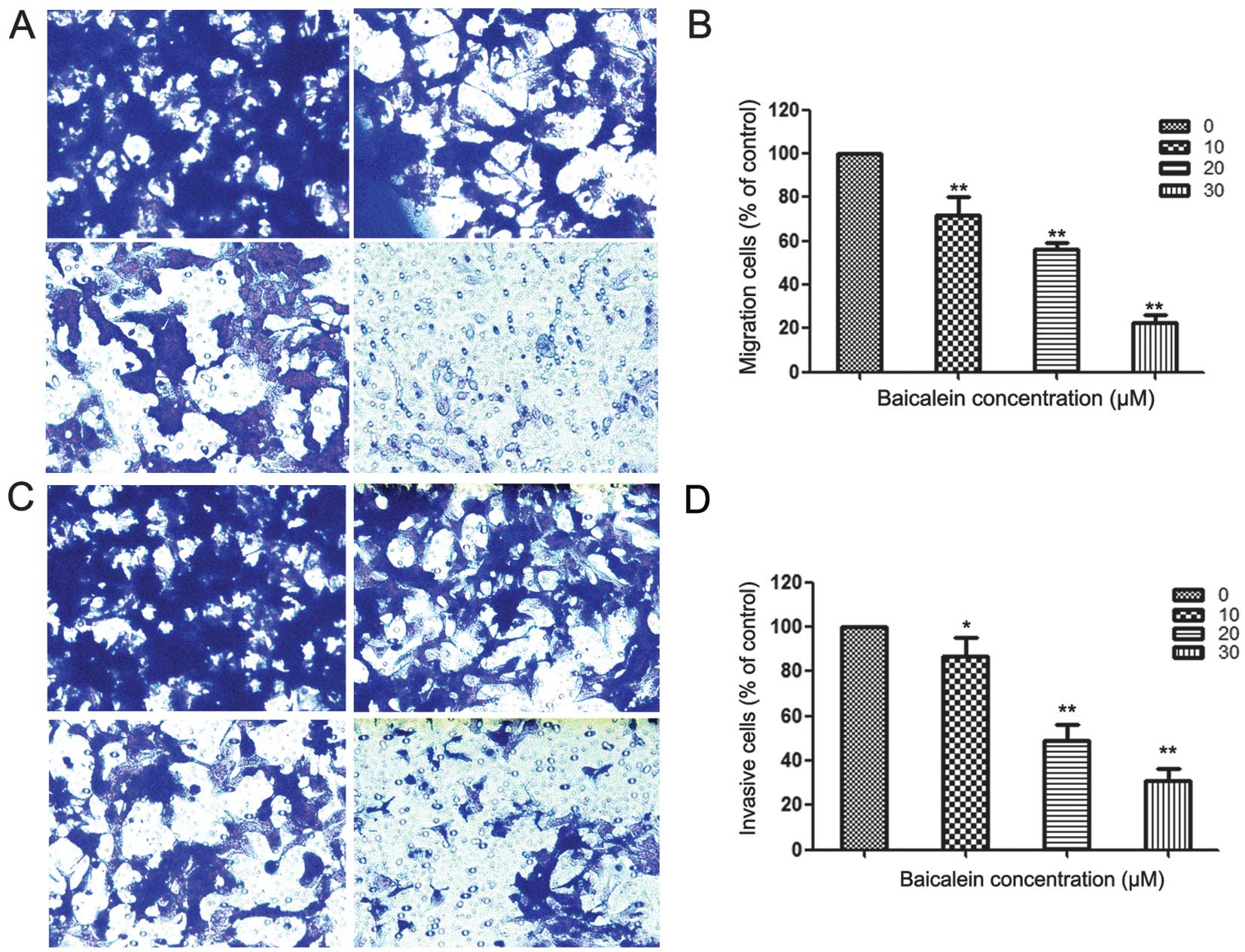 The in vitro migration and invasion assays were conducted in a Transwell® chamber with a Costar® 8-µm pore size polycarbonate membrane (Corning Life Sciences, Cambridge, MA, USA) coated with Matrigel™ or not, as described previously (11). Briefly, cells were trypsinized and suspended to a final concentration of 1×106 cells/ml in serum-free medium. The suspended cells were treated with varying concentrations of baicalein (0, 10, 20 and 30 µΜ) for 24 h prior to seeding and then added into each upper chamber of the Transwell. The bottom chamber contained medium supplemented with 10% FBS to serve as a chemoattractant. Following incubation for 24 h at 37°C in a humidified atmosphere of 5% CO2, all of the non-invaded cells were removed from the upper face of the Transwell membrane using a cotton swab, and the invaded cells were fixed, stained and counted.