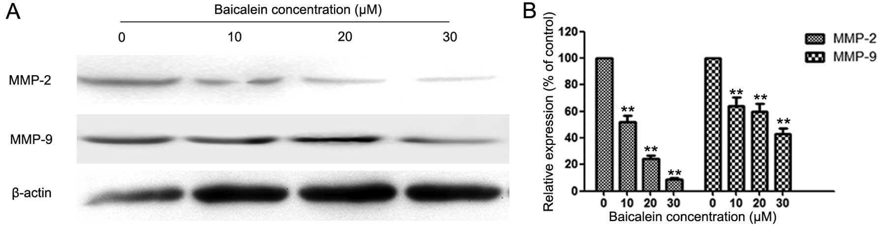 The protein expression levels of MMP-2 and MMP-9 in DLD1 cells that were exposed to different concentrations of baicalein was examined. Cells were treated with 0, 10, 20 and 30 µM baicalein for 24 h and then subjected to western blotting. Fig. 3A and B shows that baicalein significantly reduced the protein expression levels of MMP-2 and MMP-9 in a concentration-dependent manner compared with the control group (P<0.01).