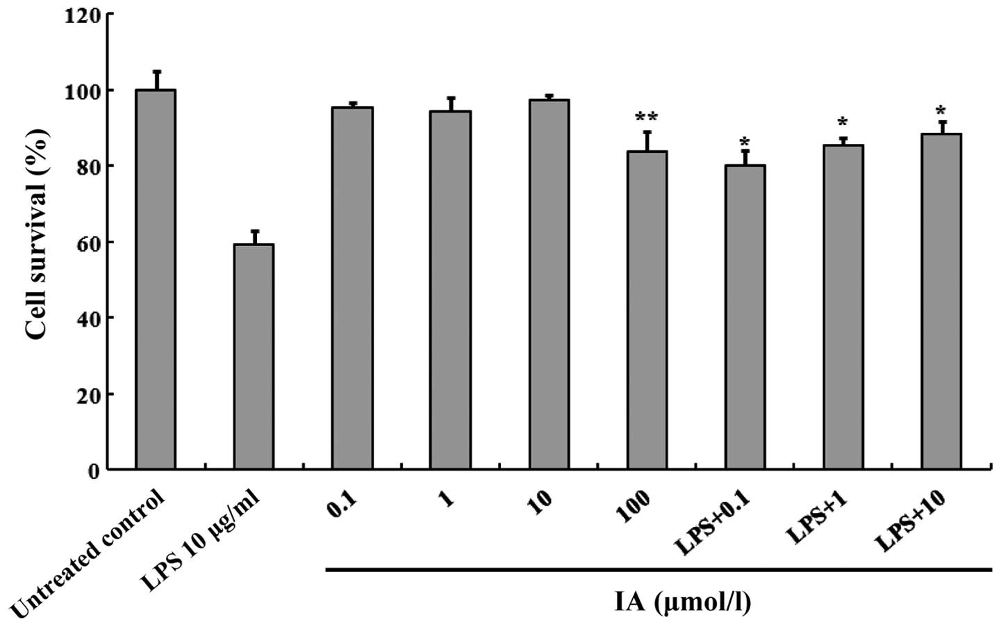 The effect of IA on the viability of the A549 cells was subsequently investigated. The cells were incubated with varying IA concentrations for a period of 12 h in a serum-free medium. Cell viability was determined using an MTT reduction assay. As presented in Fig. 2, a concentration of 100 µmol/l IA was observed to significantly decrease cellular MTT reduction (P<0.05), but did not exhibit any toxicity at ≤10 µmol/l. Additionally, IA was tested at 0.1–10 µmol/l to determine whether it improved LPS-induced cell inhibition. For this experiment, the A549 cells were treated with 10 µg/ml LPS in the presence or absence of IA at a concentration of 0.1–10 µmol/l. IA significantly increased cell growth in the presence of 10 µg/ml LPS (P<0.05). The results suggested that IA possesses the ability to attenuate the cell injury induced by LPS.