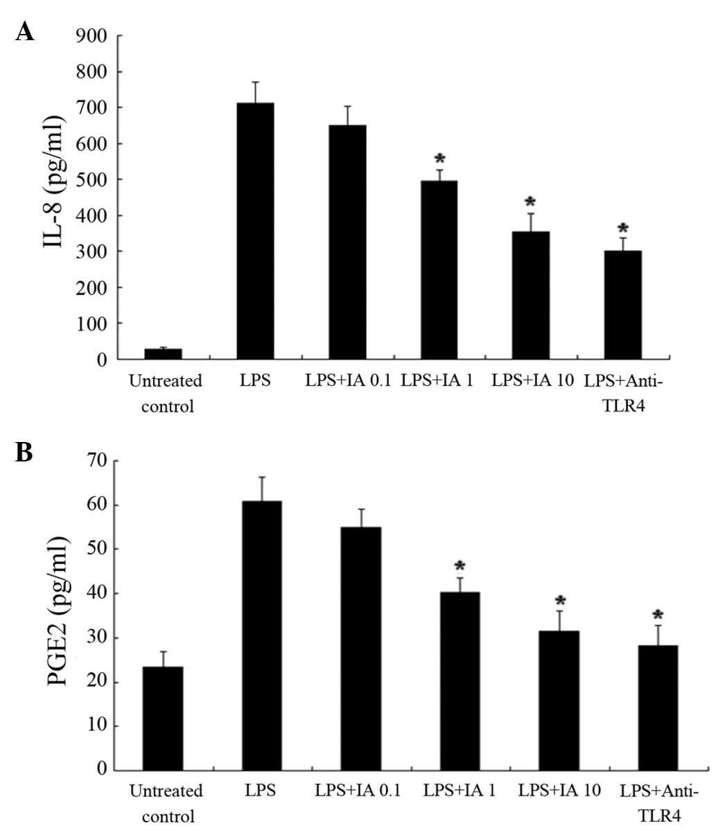 LPS was used as an inflammatory agent in the subsequent experiment. To investigate the effect of IA on the production of LPS-induced IL-8 and PGE2 (a major COX product in A549 cells), 0.1–10 µmol/l IA was added concomitantly with 10 µg/ml LPS. The level of IL-8 and PGE2 in the medium was quantitatively measured using an ELISA. As presented in Fig. 3, LPS significantly increased the amount of IL-8 and PGE2. The LPS-induced IL-8 production was significantly reduced by nearly 31 and 50% by 1 and 10 µmol/l IA, respectively (P<0.05). PGE2 production was reduced significantly by nearly 34 and 48% by 1 and 10 µmol/l IA (P<0.05), respectively. In addition, TLR4, the primary receptor for the recognition of LPS on the cell surface, was used as a positive control. LPS-induced IL-8 and PGE2 production in the A549 cells was abolished by the presence of a neutralizing antibody against TLR4 (20 µg/ml).
