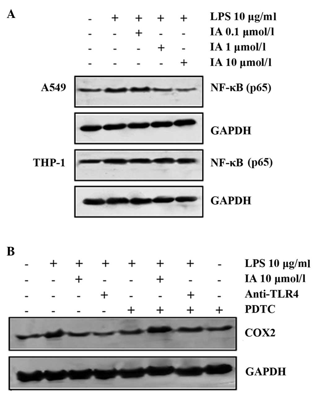 Expanding on previous studies that have reported NF-κB activation as a key signaling mechanism of LPS-induced COX2 expression in A549 and RAW 264.7 cells (17), the molecular basis for IA inhibition of NF-κB-mediated inflammatory cytokine production was investigated. Upon IA treatment, the LPS-induced NF-κB was suppressed in the A549 cells (P<0.05), but not in the THP-1 cells (Fig. 5A). To confirm the inhibition of COX2 production by the NF-κB pathway, the effect of IA treatment on LPS-induced COX2 in the A549 cells in the presence or absence of PDTC (a specific inhibitor of NF-κB) was assessed. Fig. 5B demonstrates that IA inhibited LPS-induced COX2 production. Furthermore, PDTC (50 µmol/l) reversed IA-suppressed COX2 production in the A549 cells. Therefore, it can be concluded that IA suppresses COX2 production via the NF-κB pathway.