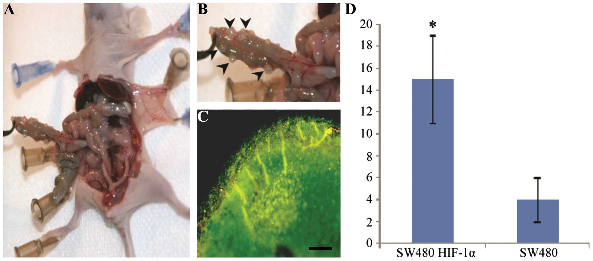 The present study constructed a lentivirus with stable HIF-1α expression, and screened the stable SW480-HIF1α cell line. Transwell migration assays demonstrated that following overexpression of HIF-1α, cell migration and proliferation were enhanced. This is in agreement with the results of previous studies that have investigated HIF-1α in cancer cells (20). In the present study, following intraperitoneal injection into nude mice, the cells formed large tumor nodules, and these nodules were identified as resulting from SW480-HIF-1α cells by using fluorescence microscopy. This method provides a novel in vivo model of HIF-1α, and in future studies, the tracking of GFP fluorescence may indicate the relevant tumor localization in vivo.