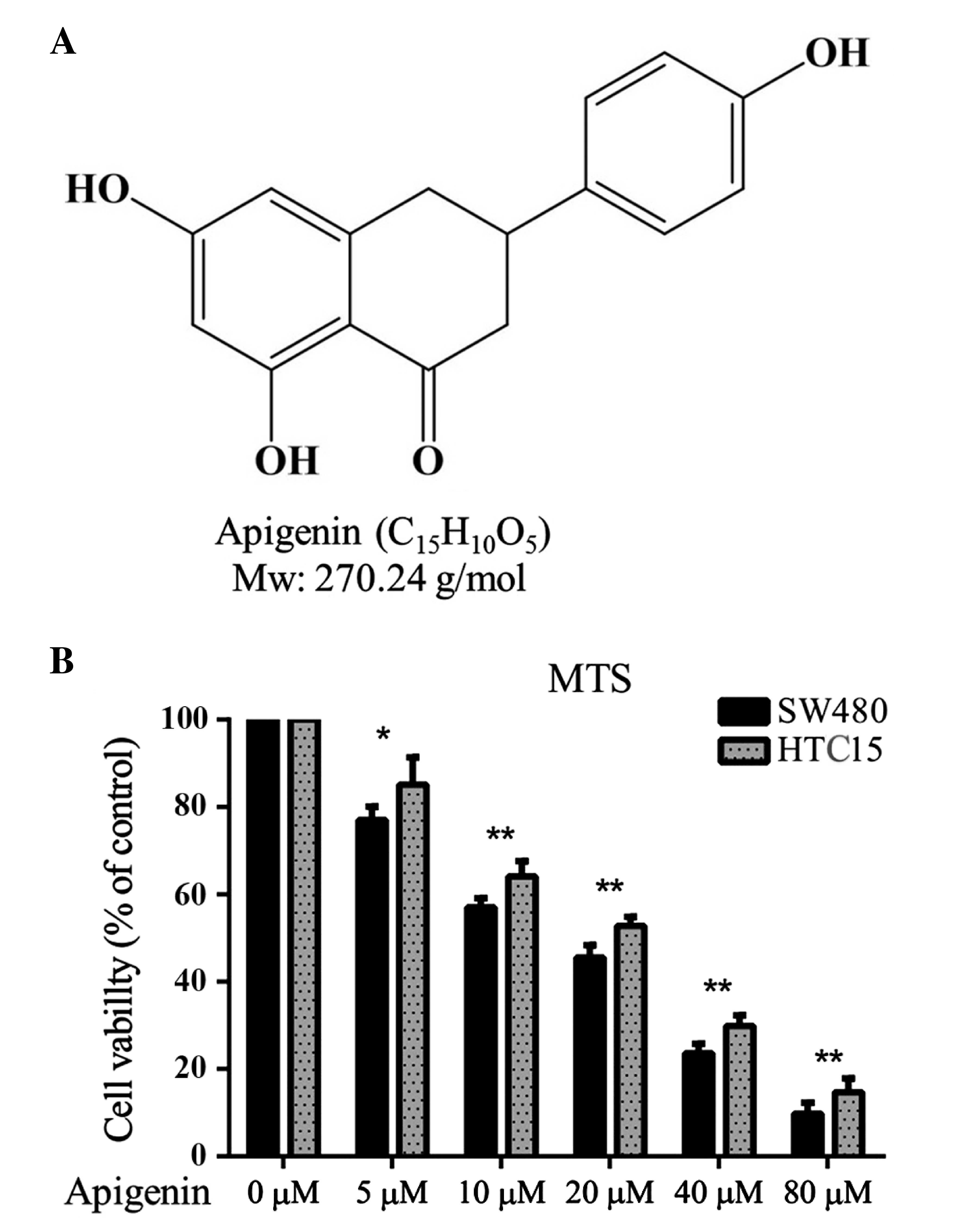 Apigenin is one of the most common flavonoids and has a molecular weight of 270.24 g⁄mol (Fig. 1A). The in vitro anti-proliferative effect of apigenin on the SW480 and HCT15 colorectal cancer cell lines was determined using a standard MTT proliferation assay. The results revealed that apigenin significantly reduced SW480 and HCT15 cell proliferation at an IC50 of 18.17 µM and 23.57 µM, respectively. These data suggest that apigenin may exhibit anti-CRC effects (Fig. 1B). The inhibitive action of apigenin was greater on SW480 cells and therefore these cells were used in subsequent experiments.