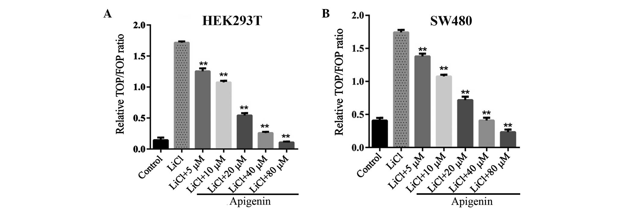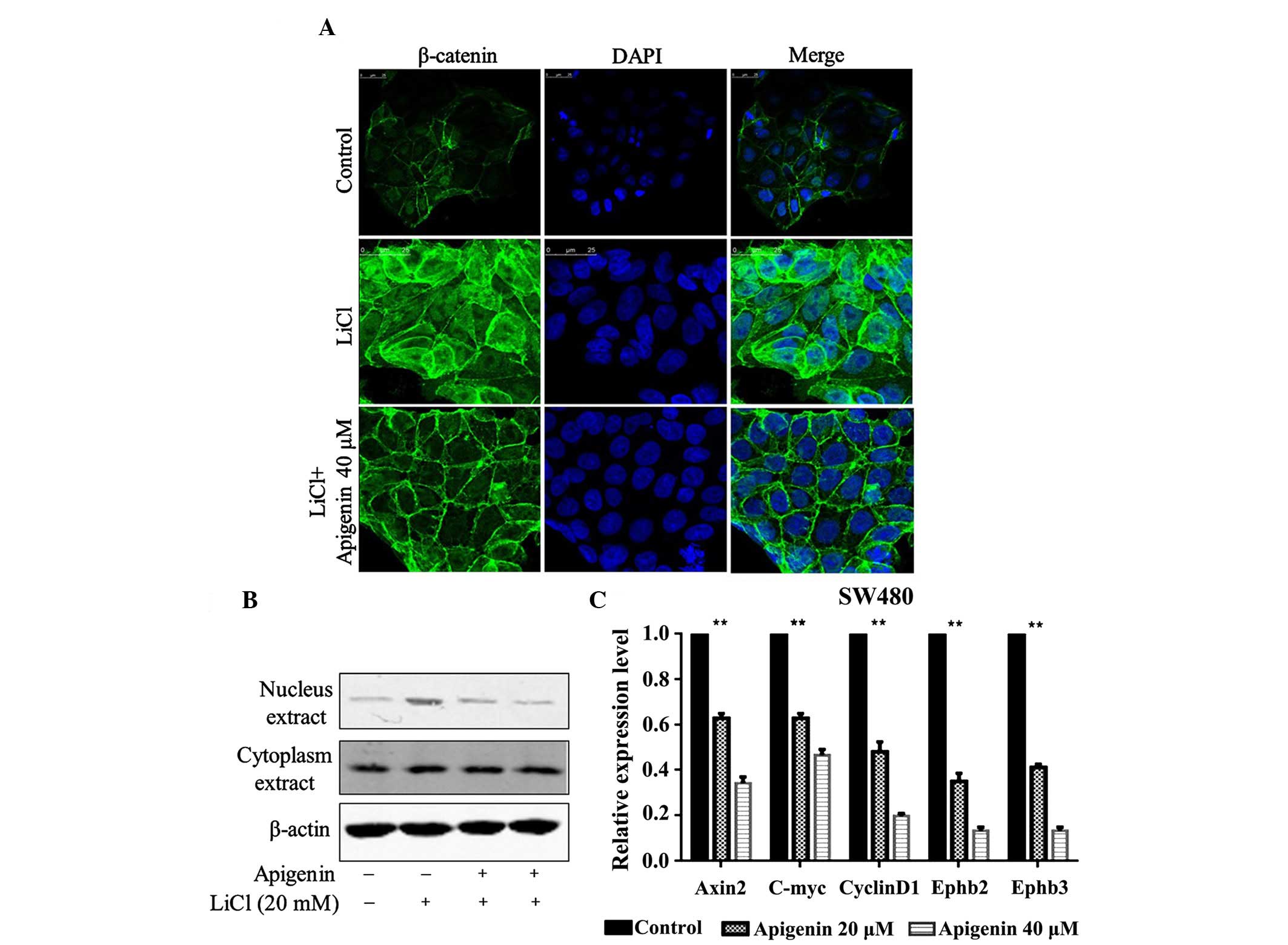 In conclusion, apigenin significantly suppressed CRC cell proliferation, migration and invasion in a dose-dependent manner. Additionally, apigenin inhibited β-catenin/TCF/LEF signaling activation, which was induced by LiCl in a dose-dependent manner. Finally, apigenin inhibited β-catenin nuclear entry and thereby prevented the expression of Wnt downstream target genes.