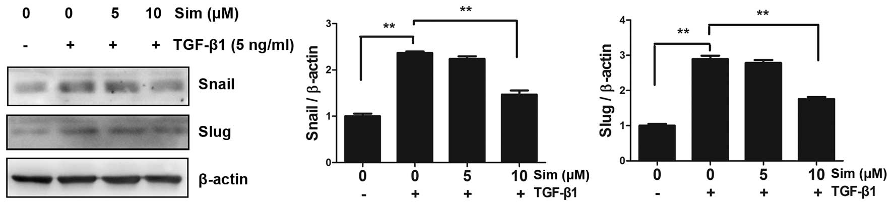 To determine whether simvastatin inhibits Snail and Slug induction via TGF-β1, the expression levels of Snail and Slug were measured using Western blotting. TGF-β1 treatment for 48 h led to significant increase in the expression of Snail and Slug (P<0.01). However, Snail and Slug were significantly inhibited by 10 µM simvastatin compared with TGF-β1 alone group cells (P<0.01) (Fig. 4). Simvastatin reduced TGF-β1-induced Snail and Slug levels at the concentration of 10 µM. These results show that TGF-β1-induced expression of EMT inducting transcription factors, Snail and Slug, were inhibited by 10 µM simvastatin.