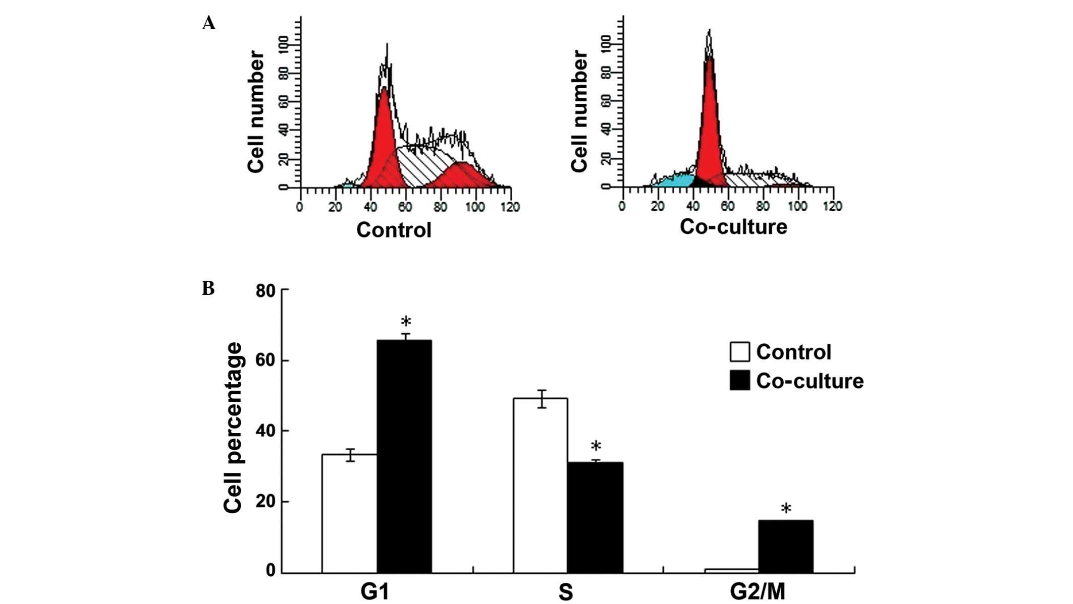 To identify whether skeletal muscle cells can inhibit the proliferation of cancer cells, mouse breast tumor cells (4T1 cells) and mouse myoblast cells (C2C12 cells) were co-cultured on Transwell plates. Mouse breast tumor cells and mouse breast tumors were co-cultured as controls. PI staining and flow cytometry were used to detect the proliferation of the 4T1 cells. As shown in Fig. 1, at 48 h after co-culture, 65% of the cells were in G1 phase and 33% were in S phase in the experimental group, compared to 31% in G1 phase and 56% that were in S phase in the control group (G1: P=0.0376 vs. control group; S: P=0.0396 vs. control group; G2/M: P=0.0479 vs. control group; n=6), demonstrating that the proliferation of the 4T1 cells was inhibited following co-culture with the C2C12 cells (Fig. 1A and B).