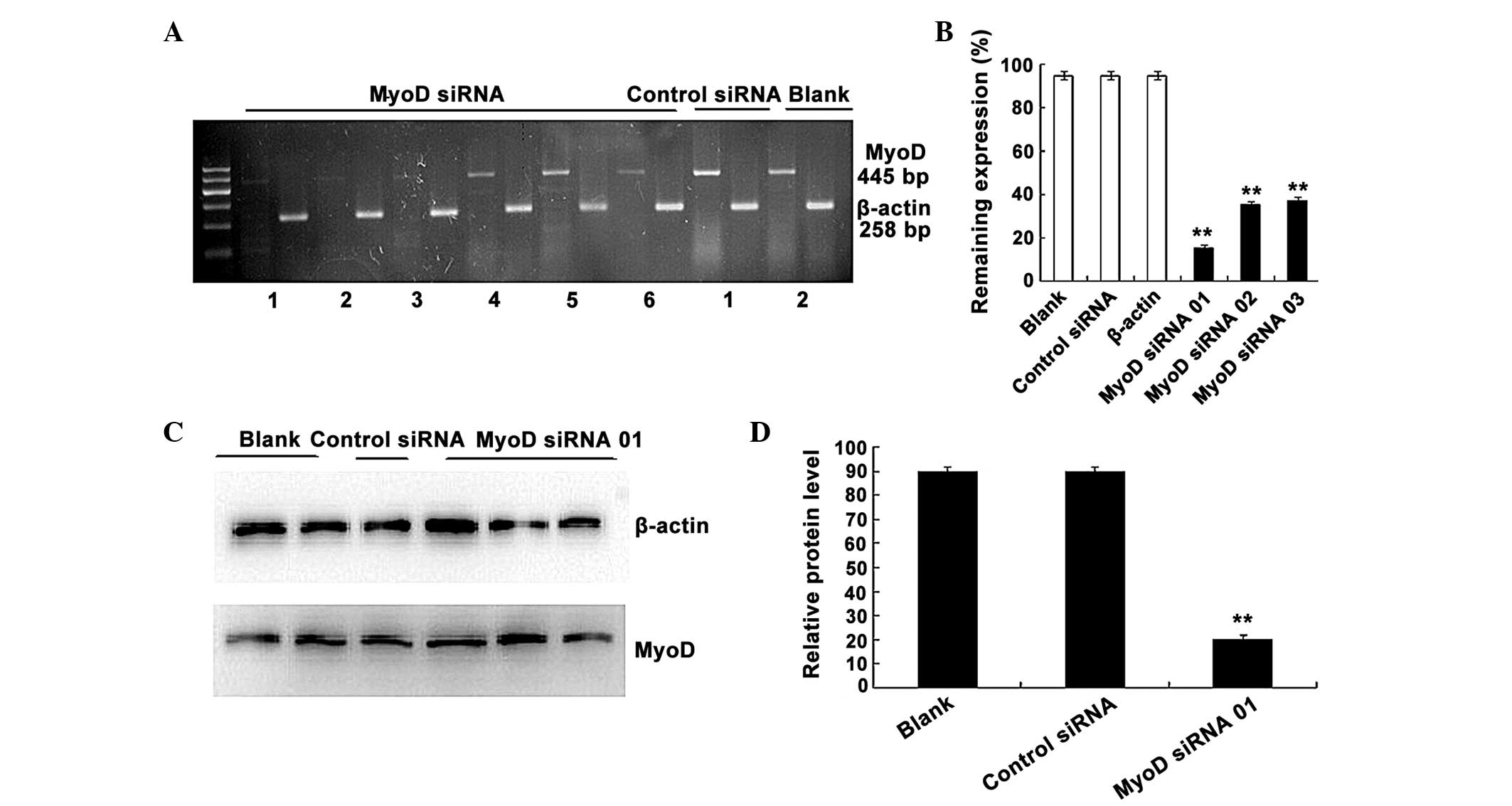 Candidate siRNAs directed against MyoD mRNA were designed by Guangzhou RiboBio Co., Ltd. (Guangzhou, China). Three potential siRNAs were selected corresponding with the prediction of single-strand domains within the mRNA secondary structure (Table I). BLAST analyses (http://blast.ncbi.nlm.nih.gov/Blast.cgi) were performed to ensure that no additional significantly matching mouse transcripts would be targeted by these siRNAs. MyoD and nonsense siRNAs were synthesized by Guangzhou RiboBio Co., Ltd., and transfections were conducted with Invitrogen Lipofectamine 2000 (Thermo Fisher Scientific, Inc.), according to the manufacturer's instructions. Reverse transcription (RT)-polymerase chain reaction (PCR) and western blotting were used to detect MyoD expression following siRNA transfection.