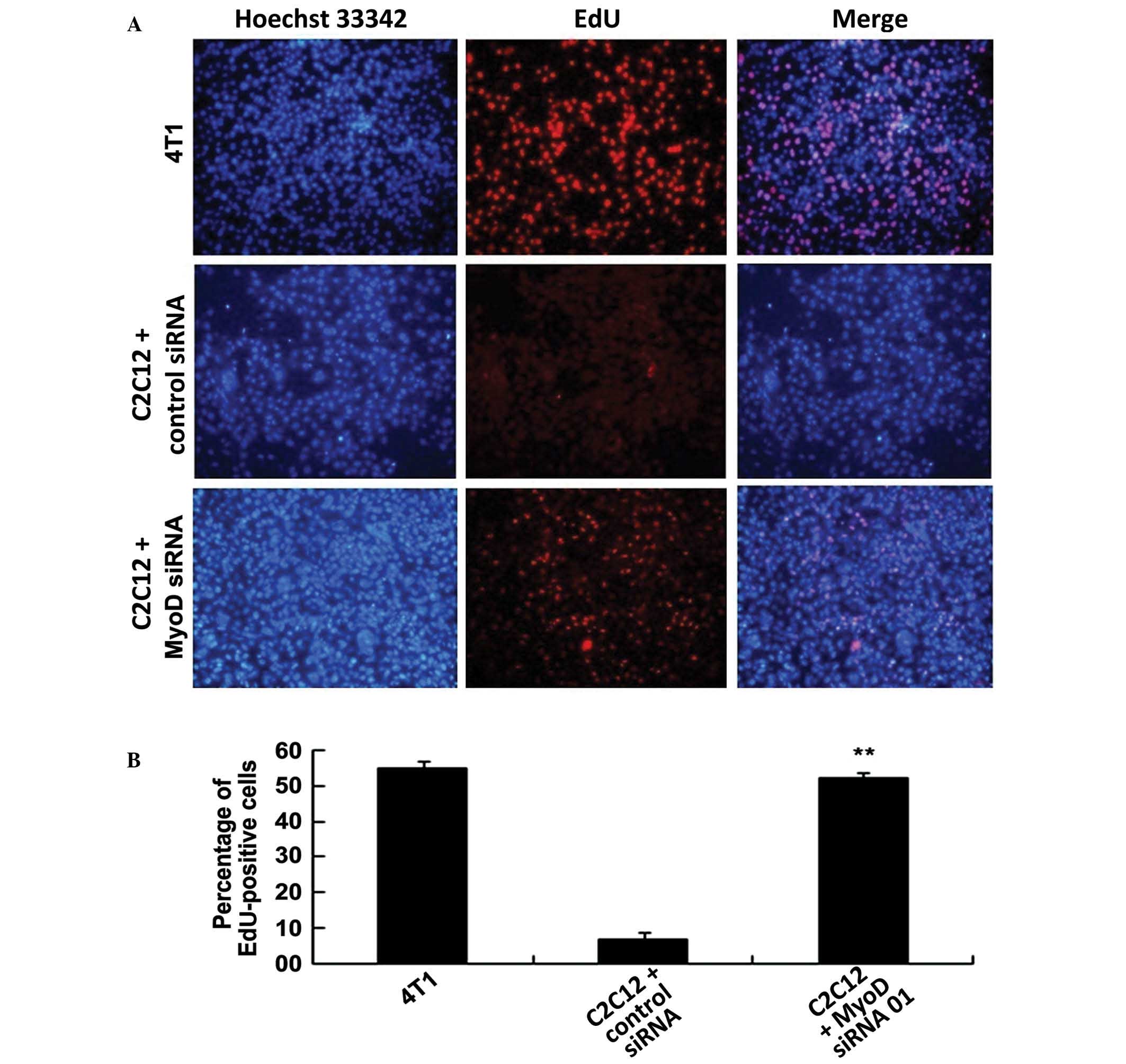 To further assess the effects of MyoD on cancer cell proliferation, mouse breast tumor cells were co-cultured with MyoD-silenced mouse myoblast cells. Proliferation of the 4T1 cancer cells was significantly inhibited in the group that was co-cultured with the control (untransfected) C2C12 cells. However, in the group that was co-cultured with the MyoD-silenced C2C12 cells, the 4T1 cells exhibited no change in proliferative activity compared with the 4T1 cells cultured in the absence of C2C12 cells. These results suggest that MyoD was responsible for inhibiting the proliferation of the 4T1 cells, indicating that this protein may act as an endogenous factor to inhibit cancer cell proliferation (20).