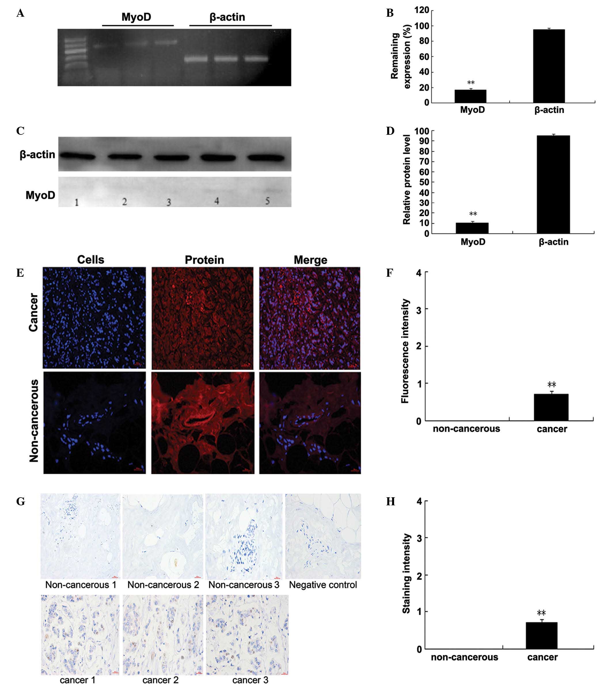 To further characterize MyoD expression in breast cancer tissue, breast cancer and normal tissue samples were obtained from 7 randomly selected breast cancer patients and assessed its expression using immunofluorescence and immunohistochemistry. The two assays revealed weak MyoD expression in the breast cancer and control human breast tissues (immunofluorescence: 0.97±0.01, P=0.00448 vs. control, n=7, unpaired t-test; immunohistochemistry: 0.95±0.01, P=0.00377 vs. control, n=7, unpaired t-test) (Fig. 4E–H). In addition, Fig. 4 shows evident differences between the cancer and control tissues. The present study aimed to test the expression of MyoD in the tissues. The other differences between the control tissues and the cancer may be due to the atypia of cancer cells. To the best of our knowledge, this is the first report of low levels of MyoD expression in breast cancer tissue.