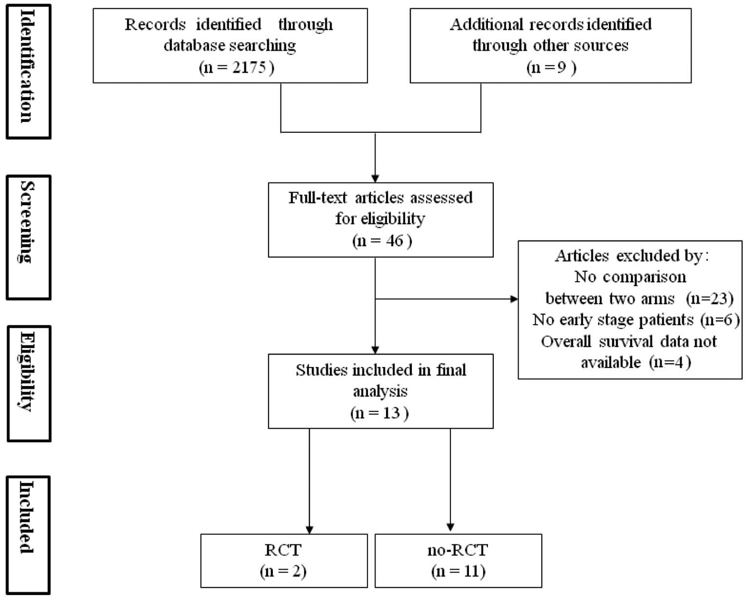 Randomized control trials (RCTs) and prospective or retrospective studies (non-RCTs) directly comparing systematic lymphadenectomy and no systematic lymphadenectomy in patients with clinically localized endometrial cancer were eligible for inclusion. Studies were included if they met the following criteria: i) They involved patients with pathologically proven early-stage endometrial cancer determined to be preoperative FIGO stage I or occult stage II disease; and ii) they provided data on Kaplan-Meier analysis of OS for patients who underwent surgical resection. Studies involving patients who were diagnosed with other malignant neoplasms were excluded.