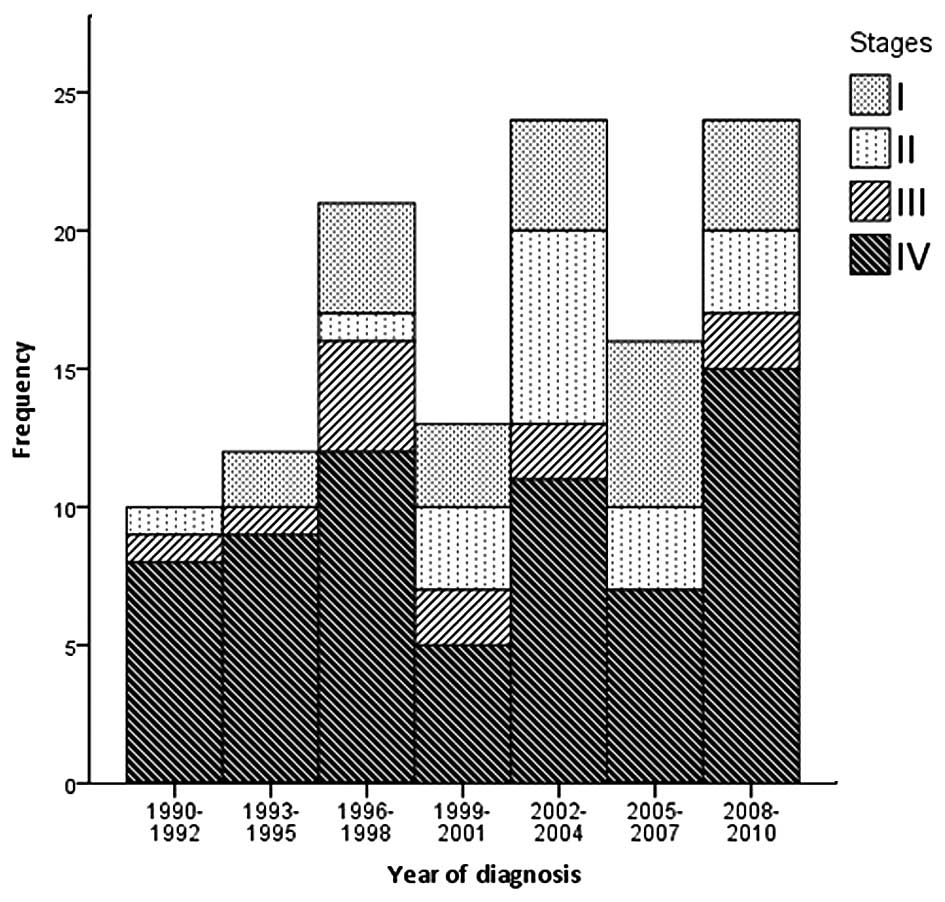 Stages at diagnosis of medullary thyroid carcinoma along the years.