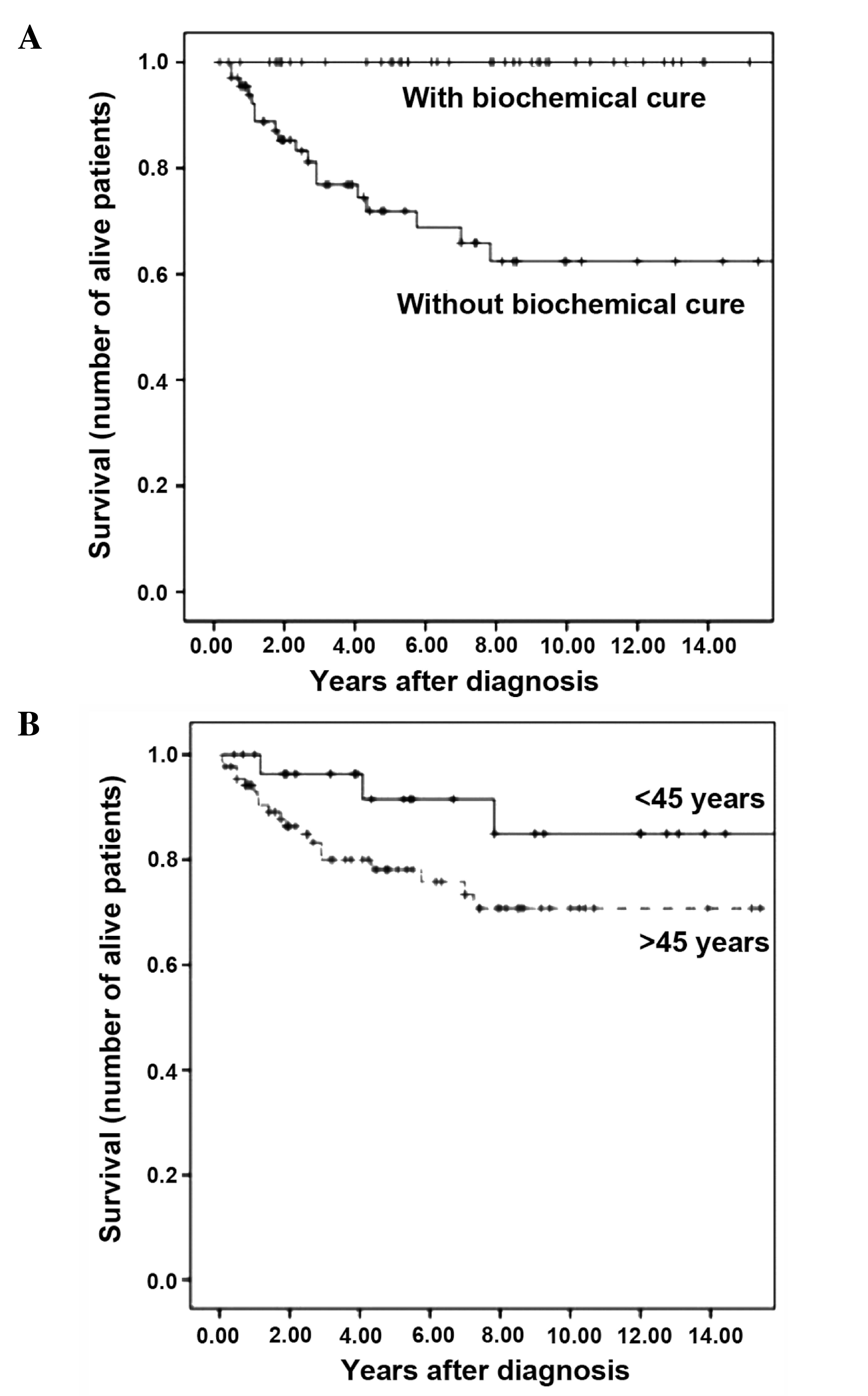 Univariate analysis. (A) Biochemical cure following primary surgery was a favorable prognostic factor (P<0.001). (B) Age did not influence survival when patients diagnosed by genetic screening or calcitonin stimulation with pentagastrin were excluded from the analysis (P=0.077).