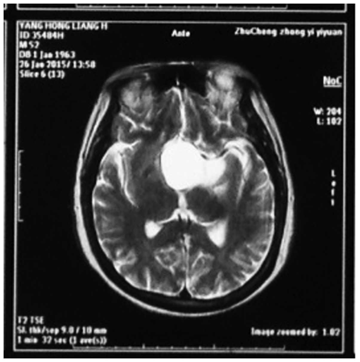 Craniopharyngioma is a common benign tumor of the sella region and it grows in the midline position of the sella-hypothalamus and is closely associated with the peripheral brain tissues, important nerves and blood vessel structures (1). It is difficult to achieve gross total removal of craniopharyngioma, thus, during the postoperative period, a considerable number of patients suffer from a high rate of mortality, tumor recurrence and postoperative complications (2). Selecting an appropriate surgical approach that allows preservation of vital structures including the hypothalamus is the key to achieving gross total removal and reduce postoperative complications (3,4). It has been reported that, fronto-basal interhemispheric approach achieves a high rate of gross total removal of tumor and pituitary stalk preservation (5) and is being widely applied in clinical setting.