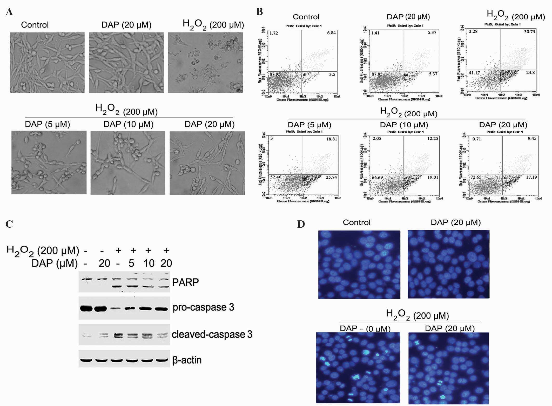 Oxidative stress has been widely implicated in neuronal cell death, and is associated with a variety of chronic neurodegenerative diseases, including Parkinson's, Alzheimer's and Huntington's disease. H2O2 is a strong oxidant, which reduces cell viability and increases cell apoptosis (13). Currently, great effort is being made to identify potent natural antioxidants with neuroprotective potential, due to their low toxicity and absence of clear side effects. Daphnetin, a natural antioxidant, exhibits a variety of biological effects, including anti-inflammatory and antitumor effects (14). Recently, studies have demonstrated that daphnetin exhibits a neurotrophic effect on peripheral nerve regeneration by suppressing nuclear factor-κB expression (15), provides a neuroprotective effect against glutamate-induced toxicity in immortalized mouse hippocampal HT22 cells and ischemic brain injury (16), and prevents excitotoxicity by inhibiting the N-methyl D-aspartate receptor subtype 2B -containing receptors and the subsequent calcium overload in cultured cortical neurons (17). These studies suggest that daphnetin has a neuroprotective effect, which is consistent with the present findings. The present study confirmed that treating PC12 cells with H2O2 resulted in suppression of cell viability in a dose-dependent manner; however, pretreatment of these cells with various concentrations (5, 10, 20 µM) of daphnetin significantly increased PC12 cell viability (Fig. 1). The present study further investigated whether daphnetin has protective effects against H2O2-induced nerve cell apoptosis. Cell morphology analysis revealed that untreated PC12 cells exhibited typical long fusiform-like morphology, while treatment with H2O2 (200 µM) for 24 h resulted in shrunken, scattered and floating cells. However, pre-incubation with daphnetin clearly reversed the morphology induced by H2O2 (Fig. 2A). The cell apoptotic ratio was detected using flow cytometry, and the present data revealed that the number of apoptotic cells was significantly reduced in daphnetin-pretreated PC12 cells compared with cells stimulated with H2O2 (Fig. 2B). The present study also examined the activation of apoptotic proteins by immunoblotting, in order to confirm the occurrence of apoptosis. Upon H2O2 stimulation, cleavage of PARP and caspase 3 were clearly enhanced in PC12 cells; however, pretreatment with daphnetin significantly decreased the cleavage of PARP and caspase 3 in a concentration-dependent manner (Fig. 2C). DAPI staining of H2O2-treated cells revealed typical apoptotic morphology. However, pre-incubation with daphnetin clearly attenuated these morphological alterations (Fig. 2D). These results suggest that daphnetin exerts its neuroprotective effect via inhibition of PC12 cell apoptosis.