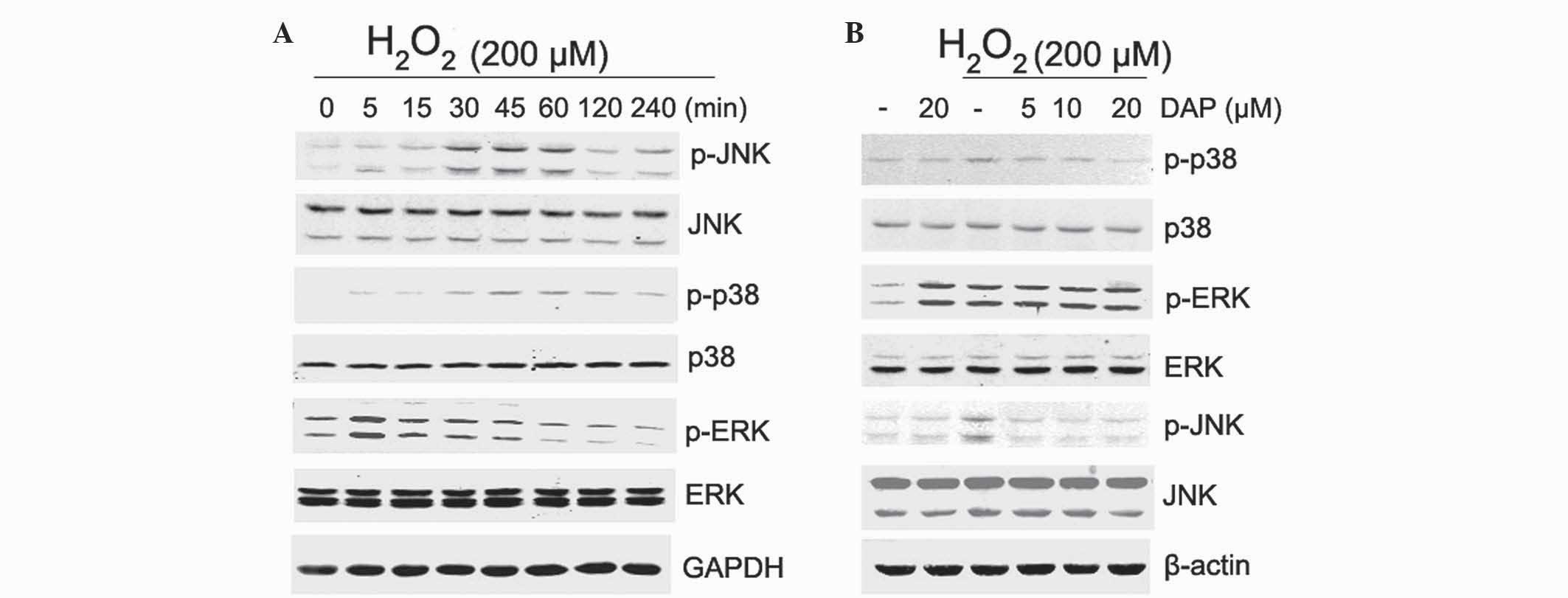 DAP reduced H2O2-induced p38 mitogen-activated protein kinase and JNK activation. (A and B) The phosphorylation level of p38 (43 kDa), ERK (42/44 kDa) and JNK (46/54 kDa) was detected by western blotting in (A) rat pheochromocytoma PC12 cells stimulated with 200 µM H2O2 for various times and (B) PC12 cells pretreated with DAP (5, 10, 20 µM) for 2 h, then stimulated with H2O2 (200 µΜ) for 30 min. Equal protein loading was confirmed by GAPDH (37 kDa) and β-actin (45 kDa). H2O2, hydrogen peroxide; DAP, daphnetin; JNK, c-Jun N-terminal kinases; ERK, extracellular signal-regulated kinase; p-phospho; GAPDH, glyceraldehyde 3-phosphate dehydrogenase.