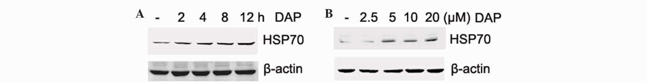 DAP induced HSP70 expression in rat pheochromocytoma PC12 cells. (A and B) PC12 cells were stimulated with (A) 20 µM DAP for 2, 4, 8, 12 h or (B) various concentrations of DAP for 12 h. Total cellular protein were extracted and subjected to western blotting probed with an anti-HSP70 (70 kDa) antibody. Equal protein loading was confirmed by β-actin (45 kDa). DAP, daphnetin; HSP, heat shock protein.