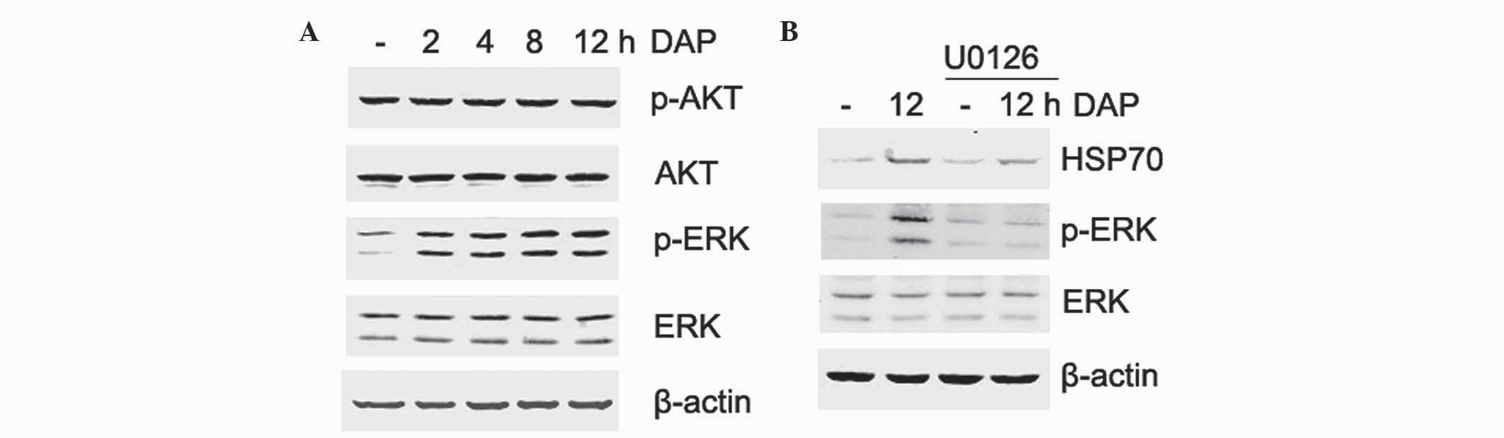 ERK signaling is involved in DAP-induced HSP70 expression. (A) Rat pheochromocytoma PC12 cells were stimulated with 20 µM daphnetin for 2, 4, 8 and 12 h, and total cellular protein was extracted and subjected to western blotting with p-Akt (60 kDa), Akt (60 kDa), p-ERK (42/44 kDa) and ERK (42/44 kDa) antibodies. (B) PC12 cells were pretreated with U0126 for 2 h, then treated with daphnetin for 12 h. Cell lysates were prepared and subjected to western blotting using HSP70 (70 kDa), p-ERK and ERK antibodies. Equal protein loading was confirmed by β-actin (45 kDa). DAP, daphnetin; HSP, heat shock protein; ERK, extracellular signal-regulated kinase; p, phospho.