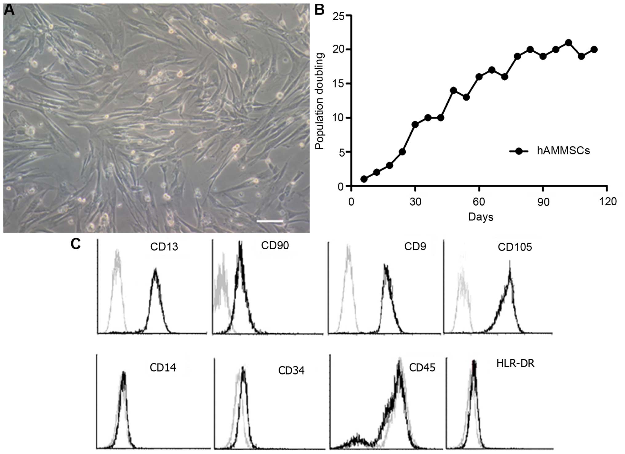 The morphology of harvested hAMMSCs at passage 4 of culture is shown in Fig. 1A. hAMMSCs exhibited strong viability by MTT assay (Fig. 1B) with ~20 population doublings, suggesting that amniotic membrane is an abundant source for the generation of mesenchymal cells. In order to estimate the purity of hAMMSC cultures, flow cytometry analysis was used to analyze the immunophenotypic surface profile of the hAMMSCs. Surface marker analysis revealed that hAMMSCs were positive for mesenchymal lineage markers CD13, CD90, CD9 (a nontrophoblast marker) and CD105, and negative for hematopoietic lineage markers CD14, CD34, CD45 and HLR-DR (Fig. 1C).