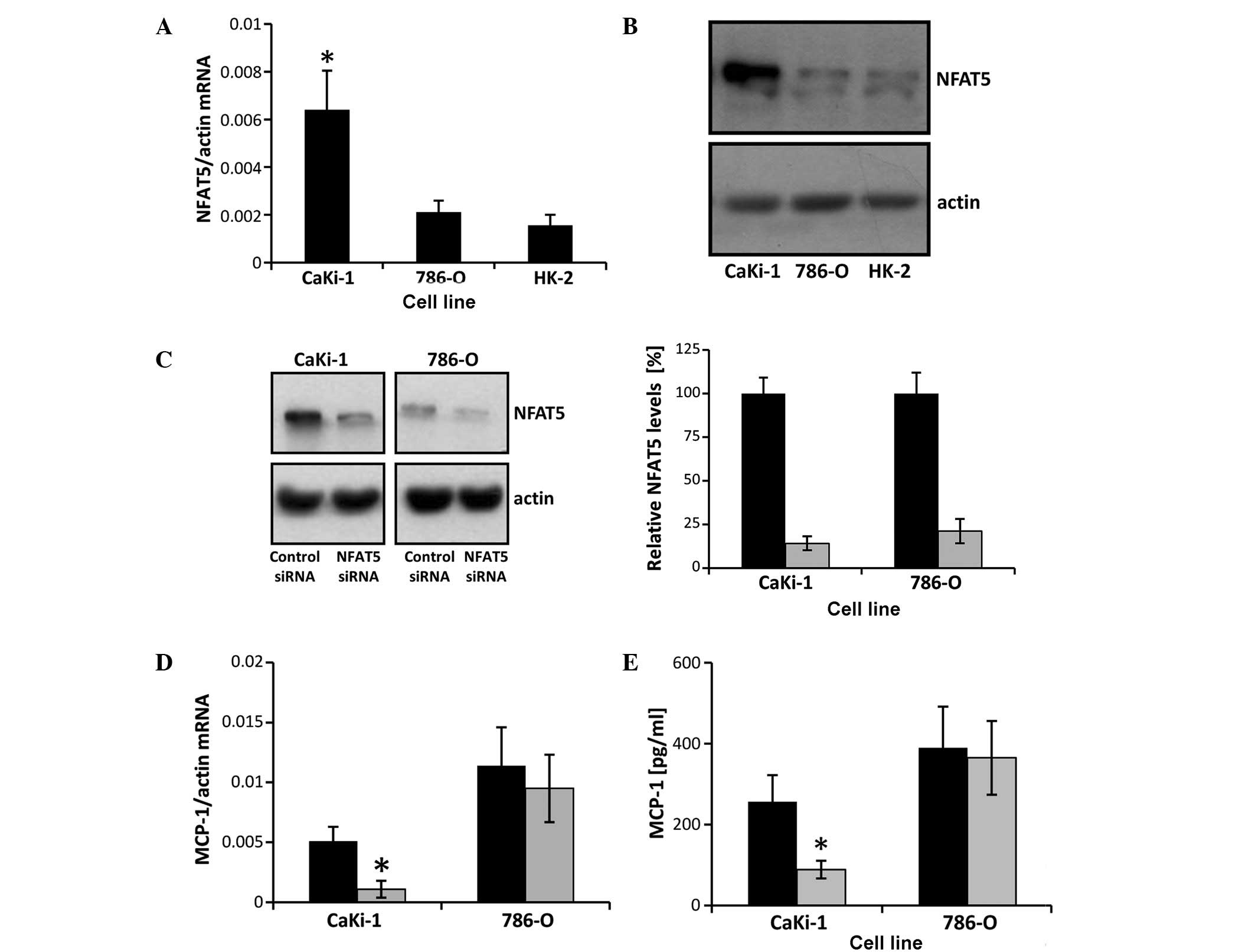 For determination of MCP-1, CCR2, NFAT5 and β-actin mRNA expression levels, total RNA was isolated from CaKi-1, 786-O and HK-2 cells using TriFast reagent (Peqlab Biotechnologie GmbH, Erlangen, Germany), according to the manufacturer's instructions. The concentration of RNA in each sample was determined spectrophotometrically at 260 nm. Absence of RNA degradation was tested by denaturing agarose gel electrophoresis on a 1.5% agarose/formaldehyde gel, checking for clear sharp bands for 28S and 18S rRNA, and absence of excessive smear. To avoid amplification of genomic DNA, intron-spanning primer pairs were designed for RT-qPCR analysis. The primers (Metabion International AG, Martinsried, Germany) used were as follows: Forward, 5′-AGTCTCTGCCGCCCTTCT-3′ and reverse, 5′-GTGACTGGGGCATTGATTG-3′ for MCP-1; forward, 5′-CTGTCCACATCTCGTTCTCGGTTTA-3′ and reverse, 5′-CCCAAAGACCCACTCATTTGCAGC-3′ for CCR2; forward, 5′-AATCGCCCAAGTCCCTCTAC-3′ and reverse, 5′-GGTGGTAAAGGAGCTGCAAG-3′ for NFAT5; and forward, 5′-CCAACCGCGAGAAGATGA-3′ and reverse, 5′-CCAGAGGCGTACAGGGATAG-3′ for β-actin. The efficiency of each primer pair was tested in initial experiments. Standard curves were generated using standards of 100, 10, 1 and 0.1 ng total starting RNA. In experiments comparing relative mRNA levels by RT-qPCR, the RNA concentration of the samples was adjusted to 25 ng/µl and constant amounts of RNA (75 ng) were used in each experiment. To ensure that the expression of the reference gene (β-actin) was stable among all three cell lines and all experimental conditions, Cq values of β-actin were compared and found no significant differences. Experiments were conducted on a CFX Connect Real Time PCR Detection System (Bio-Rad Laboratories, Hercules, CA, USA) using the SensiMix SYBR One-Step kit (Bioline; catalog no., BIO 98005), according to the manufacturers' instructions. The relative mRNA expression levels of each gene was calculated using the 2−ΔΔCq method (23), with β-actin as the housekeeping gene. Cq values were corrected for PCR efficiency according to the following formula: CqE= Cq * [log(E) / Log(2)], where E is efficiency and 100% efficiency is 2. Negative controls lacking reverse transcriptase enzyme or RNA template were used in the experiments to exclude that traces of genomic DNA or other DNA contaminations were amplified. Specificity of PCR product formation was confirmed by monitoring melting point analysis and by agarose gel electrophoresis. Each experiment was repeated six times.