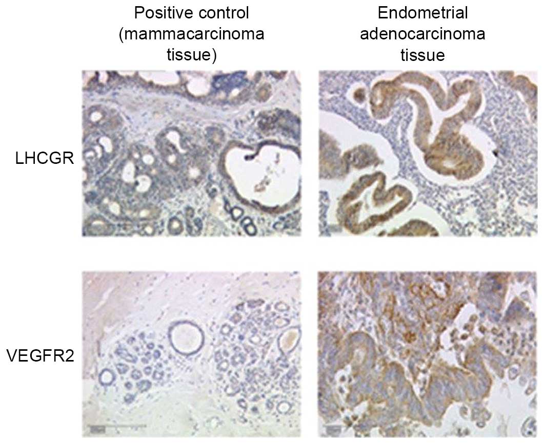 In conclusion, the present study demonstrated that there was an association between steroid hormone receptors and VEFGR and LHCGR. Steroid hormones are particularly important molecules of the human endometrium, since they regulate the composition and decomposition of the endometrium, as well as cell growth and division. VEGFR and LHCGR also participate in cell growth and neoangiogenesis, which are important features of metastasis. Therefore, the combination of these four molecules may influence the growth and metastasis of endometrial adenocarcinomas. However, it is important to remember that the use of GnRH analogues is restricted to premenopausal patients (1); thus, the formation of patient subgroups would be indispensable. Further research may identify novel therapeutic options for endometrial carcinomas that are based on existing therapies for other types of tumors. It would only be necessary to determine the hormone LHCGR and VEGFR status of a patient to administer therapy tailored to the tumor phenotype, which may have fewer side effects and a higher efficacy, thus leading to a more personalized treatment strategy for endometrial adenocarcinoma.