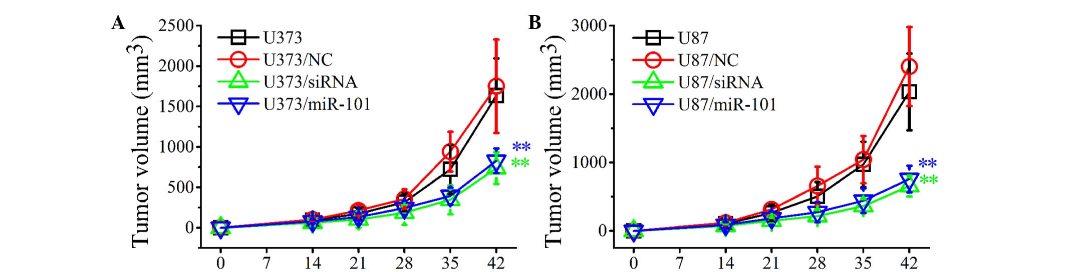 To investigate the inhibitory effects of miR-101 overexpression on the growth of established tumors, control and miR-101-transfected U373 and U87 cells were injected subcutaneously into BALB/c nude mice. The development of established tumors was monitored every day for 6 weeks. As shown in Fig. 5, the development of solid tumors was first visible at ~14 days post-inoculation and tumors grew rapidly in WT (U373 and U87) and NC-transfected (U373/NC and U87/NC) groups. By contrast, in the U373/miR-101 and U87/miR-101 groups, the tumor growth was markedly slower and the tumor volume was significantly decreased compared with control groups (Fig. 5A and B). Similar results were obtained when glioma cells were transfected with COX-2 siRNAs. The in vivo experiments indicated that miR-101 overexpression may significantly inhibit tumor growth in vivo and thus may present a useful treatment for glioma.